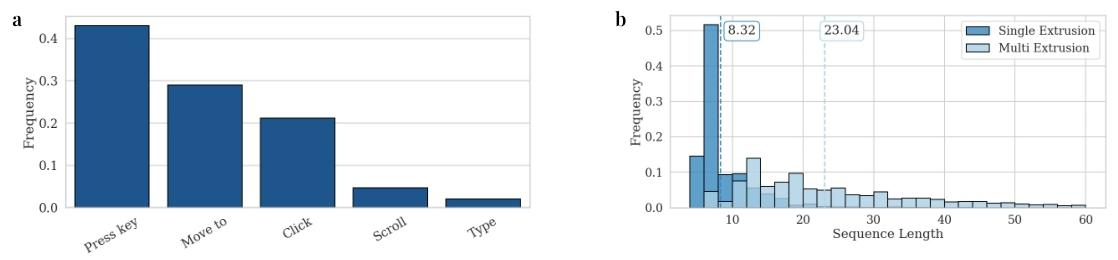 VideoCAD不仅规模大,更通过细致的统计分析展现了“人类操作CAD软件”的行为模式,为模型设计提供了依据: