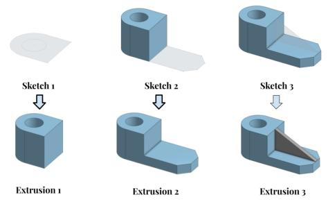 - Extrusion(拉伸):将每个草图沿指定方向拉伸成三维实体,多次Sketch+Extrusion的组合最终形成完整零件。