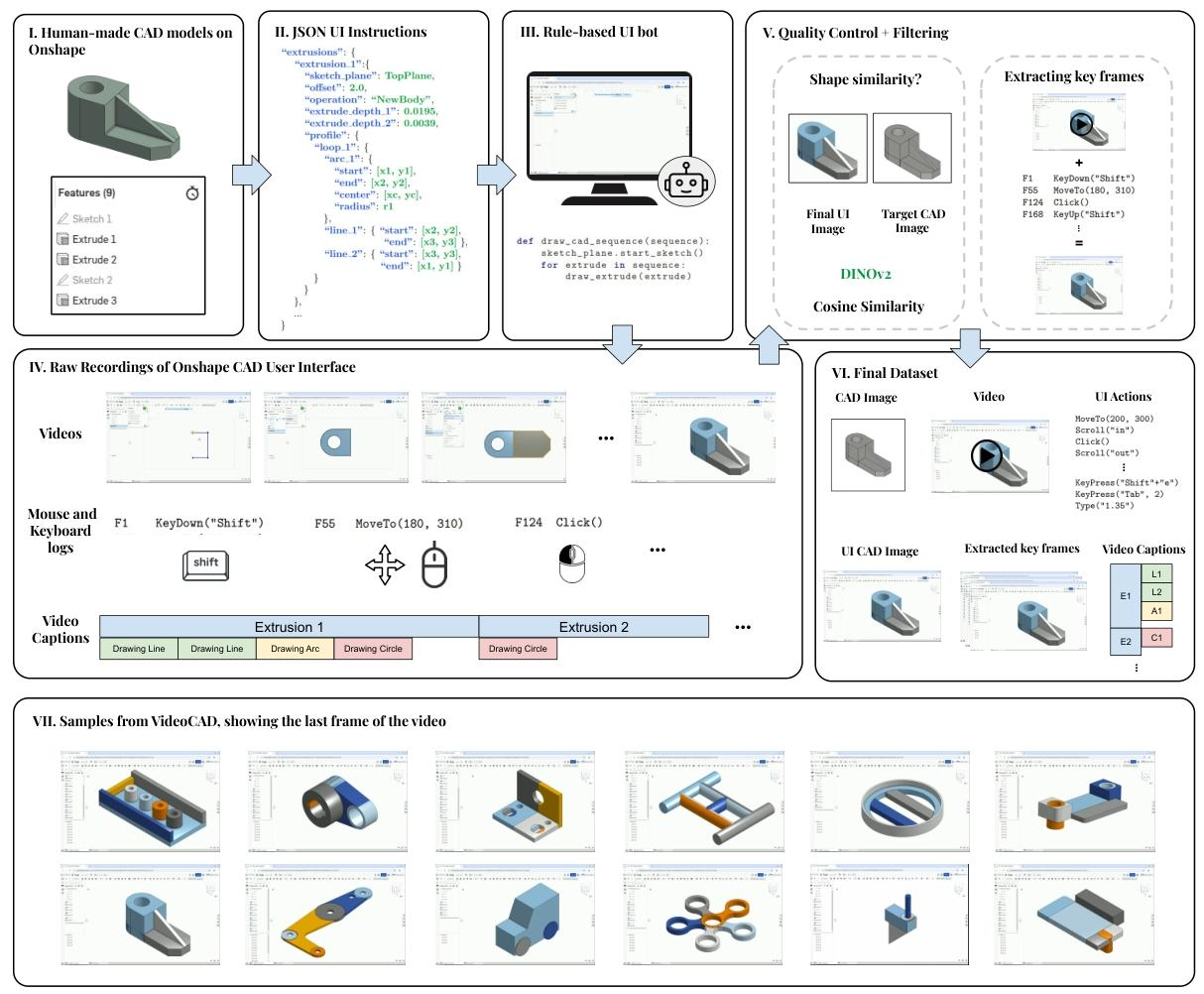 VideoCAD的构建是一个从“人工CAD设计”到“结构化数据集”的完整 pipeline,每一步都为“学习UI交互+3D推理”量身定制: