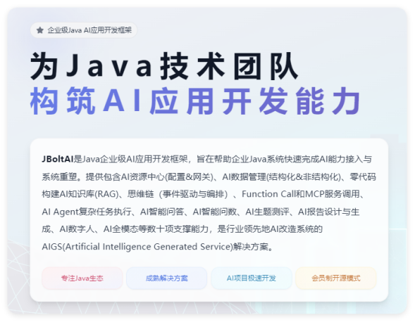 企业级 RAG 系统的核心价值,在于将分散的知识转化为可信赖、高效率的服务。JBoltAI 的五维架构,从数据质量到检索精度,从答案可靠性到系统性能,再到长期进化能力,全方位覆盖工业级应用需求。它不仅是一套技术工具,更是一个 “知识计算平台”,让 Java 团队能快速搭建属于自己的企业级知识库,让知识真正成为驱动业务的核心生产力。