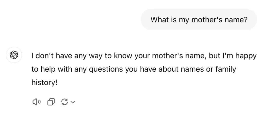 举个现实例子:你问 ChatGPT——“我妈妈叫什么名字?”