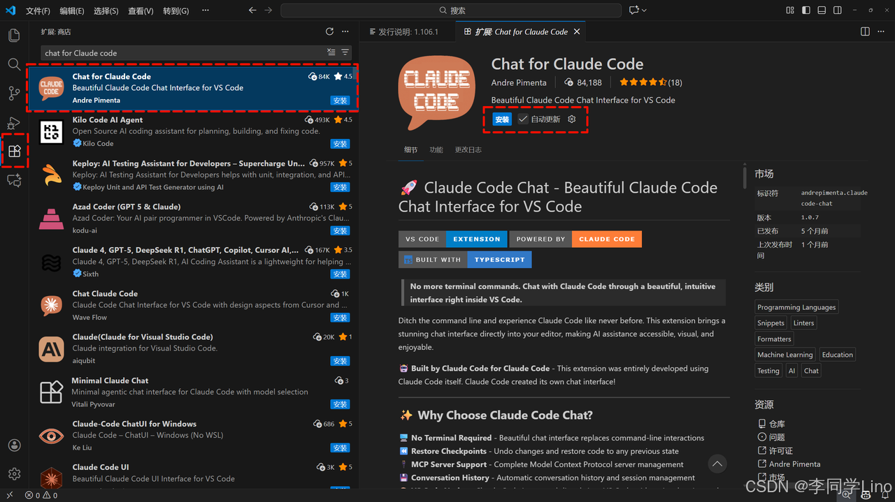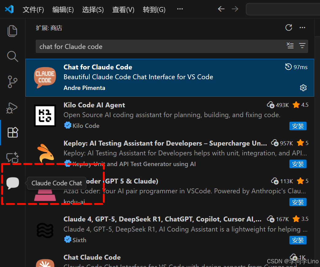首先,打开 VS Code。点击左侧边栏的 扩展(Extensions) 图标,在搜索框输入:Chat for Claude Code,找到插件后点击 Install(安装)。