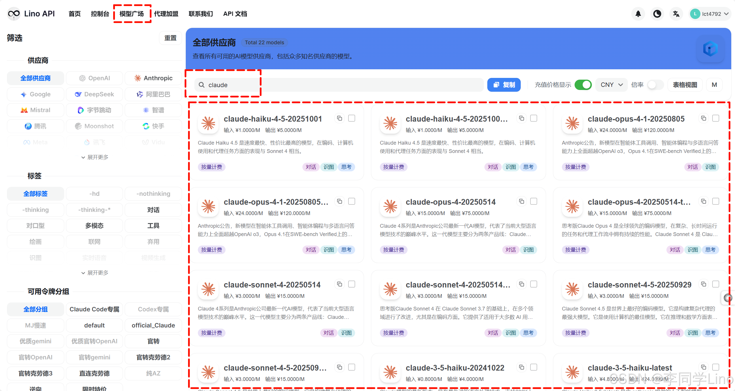 然后在【模型广场】中搜索“Claude”,就会有很多不一样的模型,可以选择一个复制到上面配置的"ANTHROPIC_MODEL",这里我填写了"claude-haiku-4-5-20251001"。
