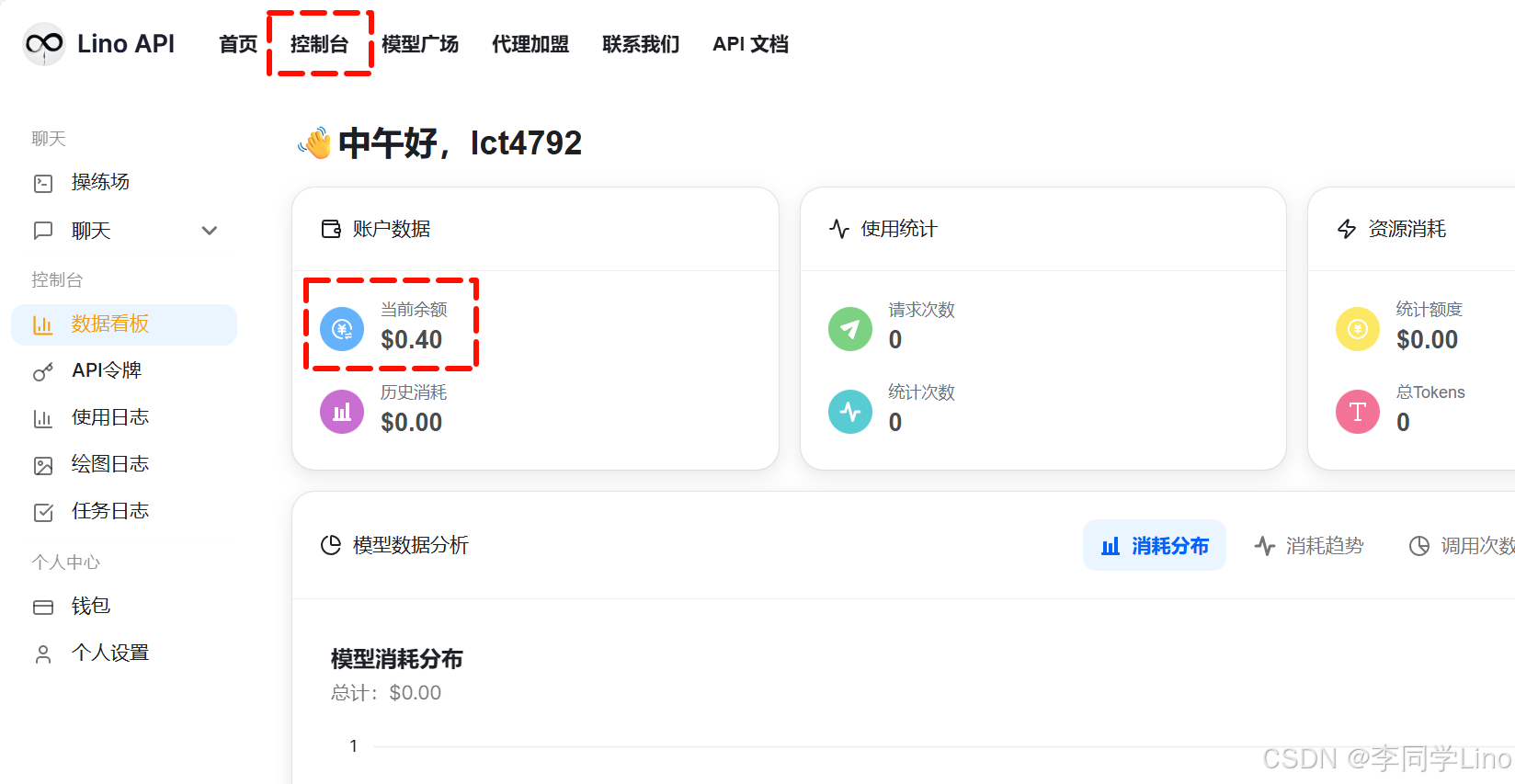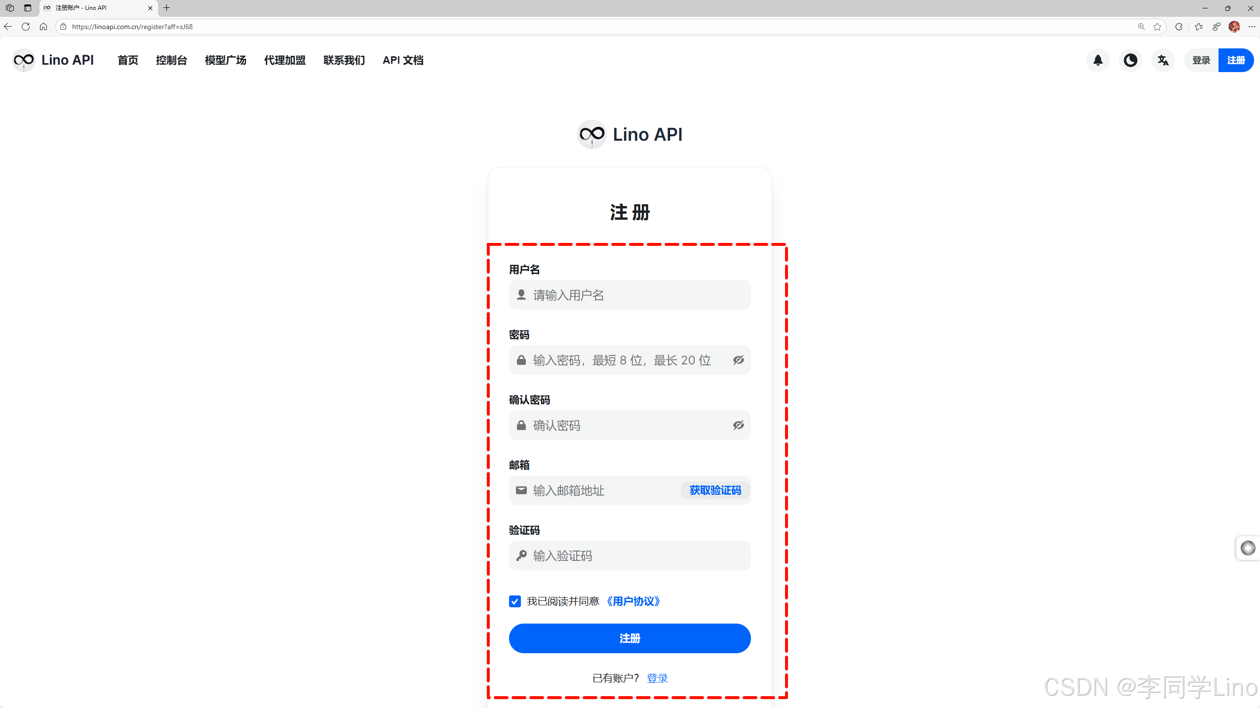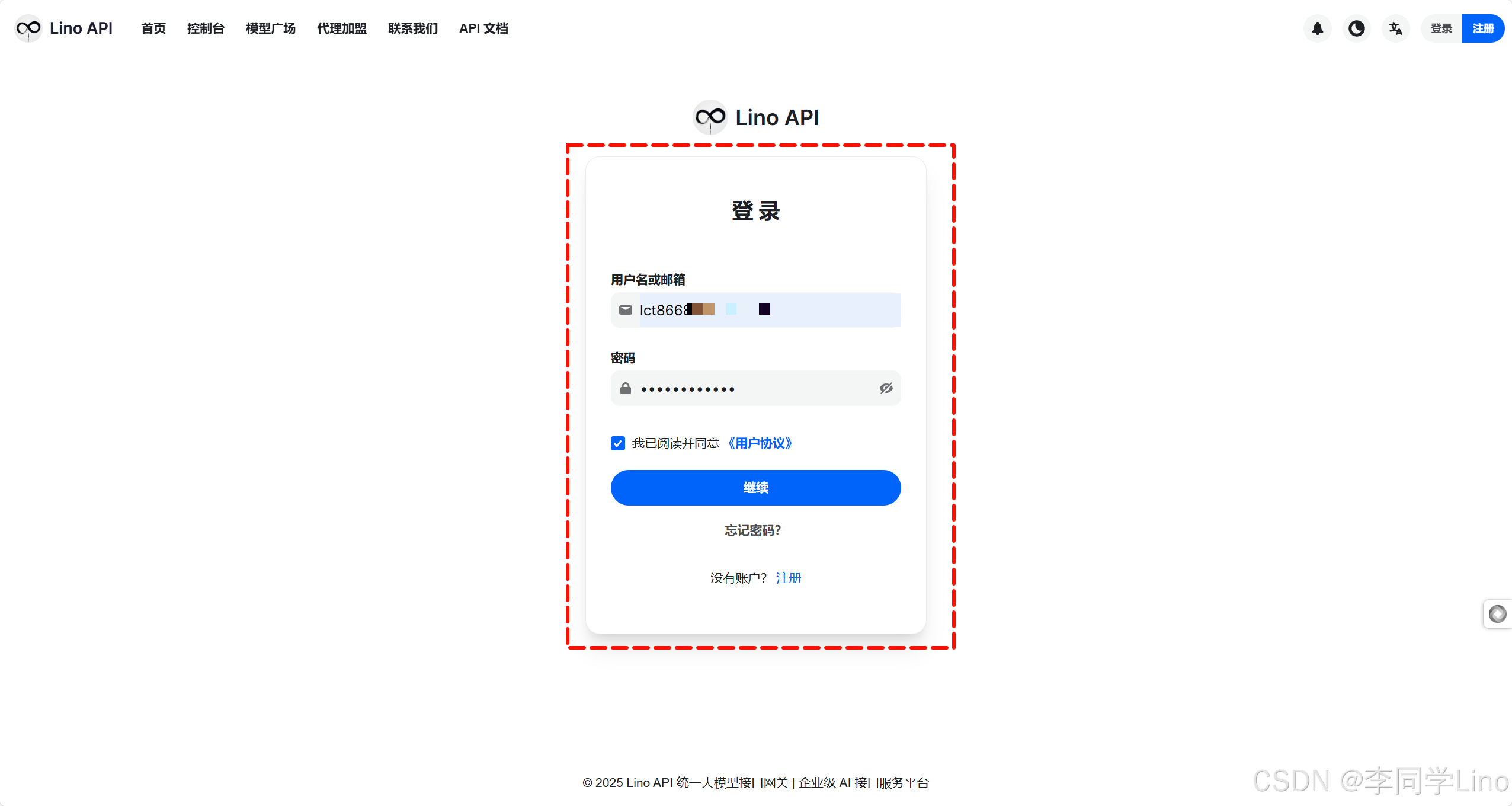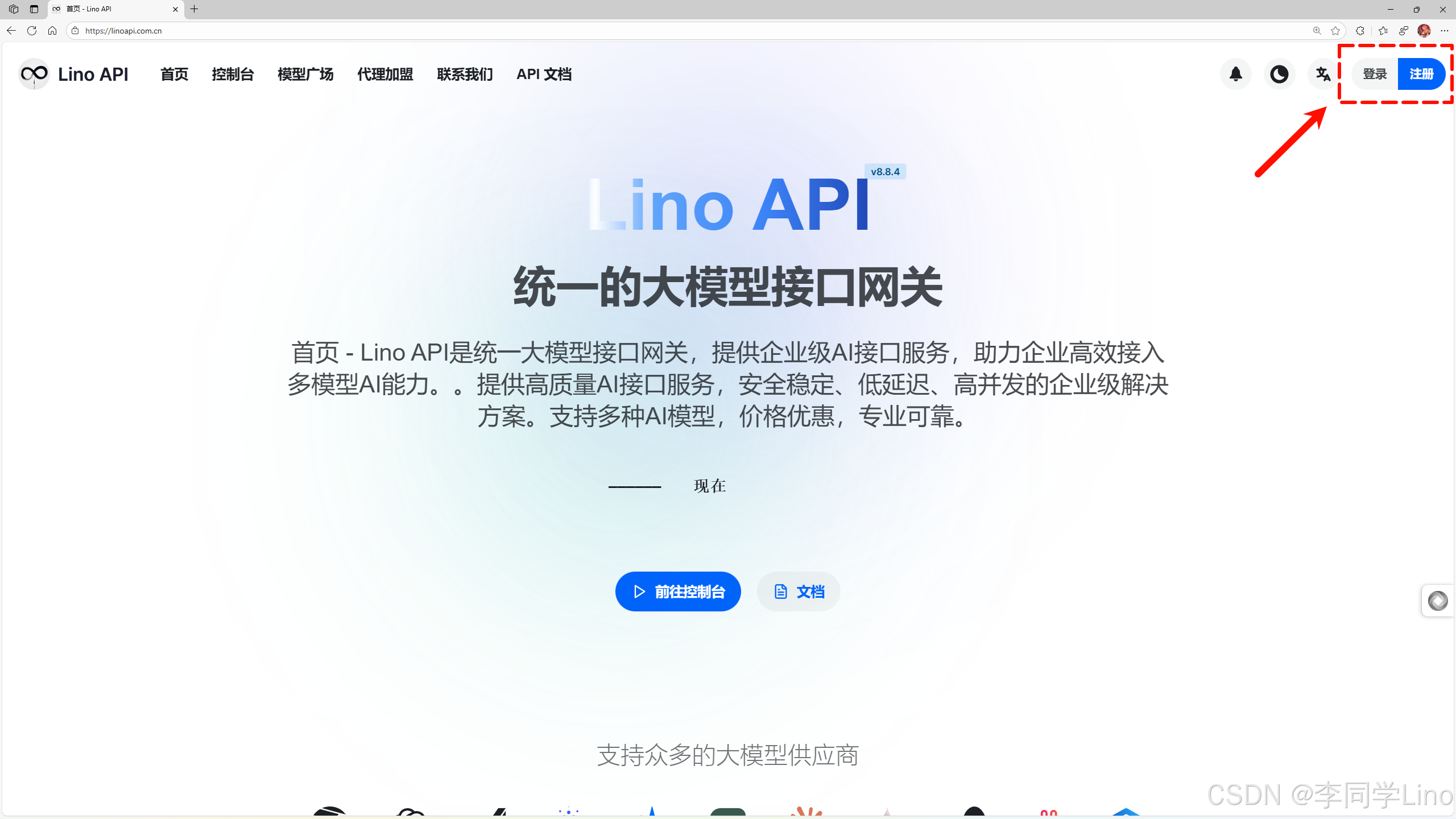 首先进入到API平台:https://linoapi.com.cn/register?aff=sJ68,点击右上角的登录/注册按钮。