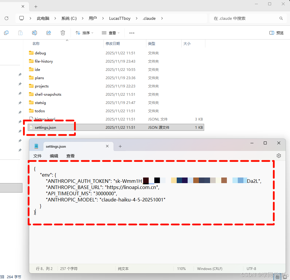 Claude Code 安装好后,需要手动指定 API 地址、Key 以及模型信息。首先在C:\Users\LucasTTboy\.claude创建一个文件夹 settings.json,然后将文件内容修改为以下格式,并替换成你自己的环境变量值:(其中"sk-xxx"需要替换成自己的APIKey!!!)