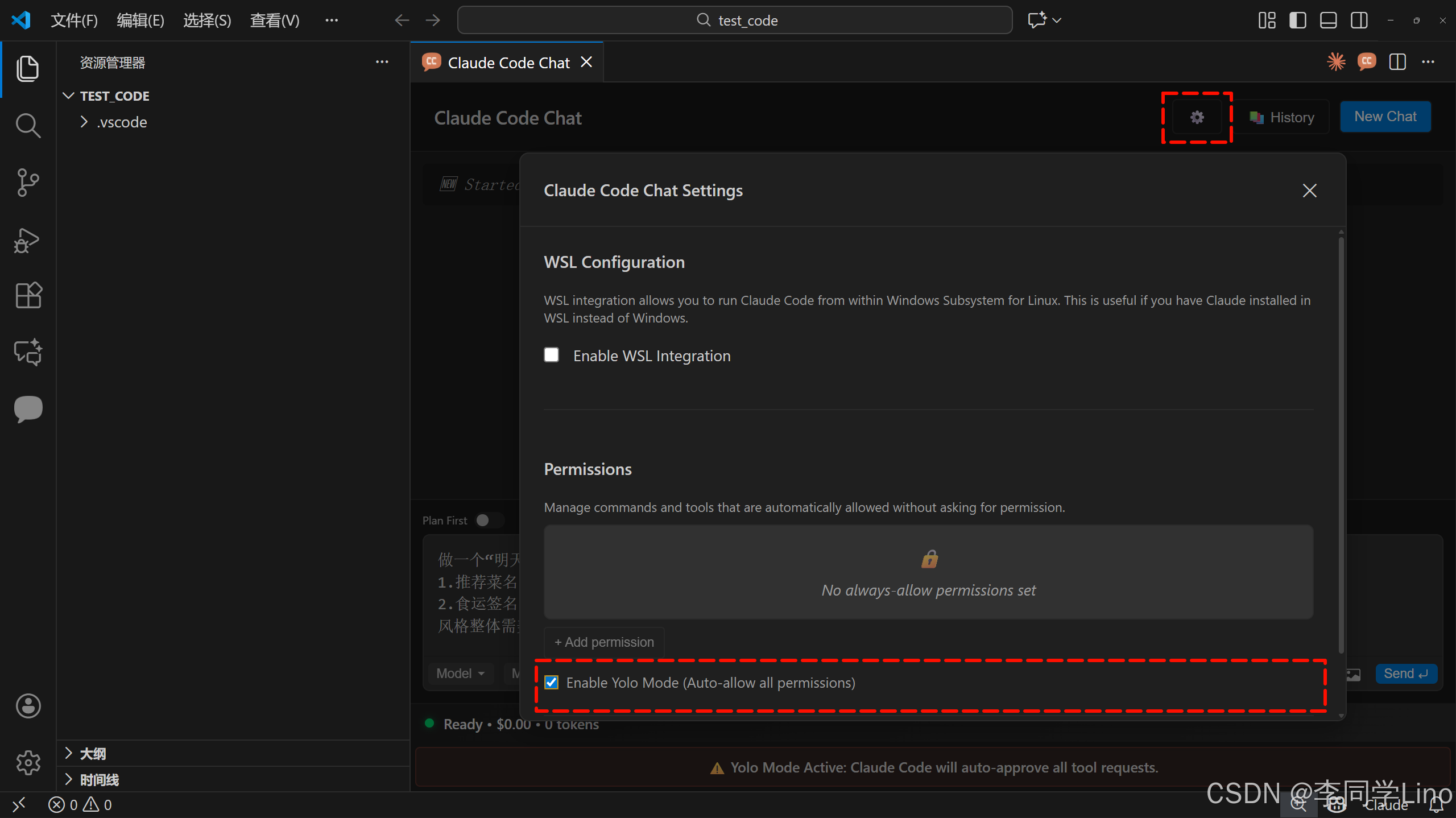 来到Claude Code Chat的设置这里,打钩"Enable Yolo Mode (Auto-allow all permissions)"可以添加给Claude Code的权限,就不需要每次点击那个"allow"的按钮了。