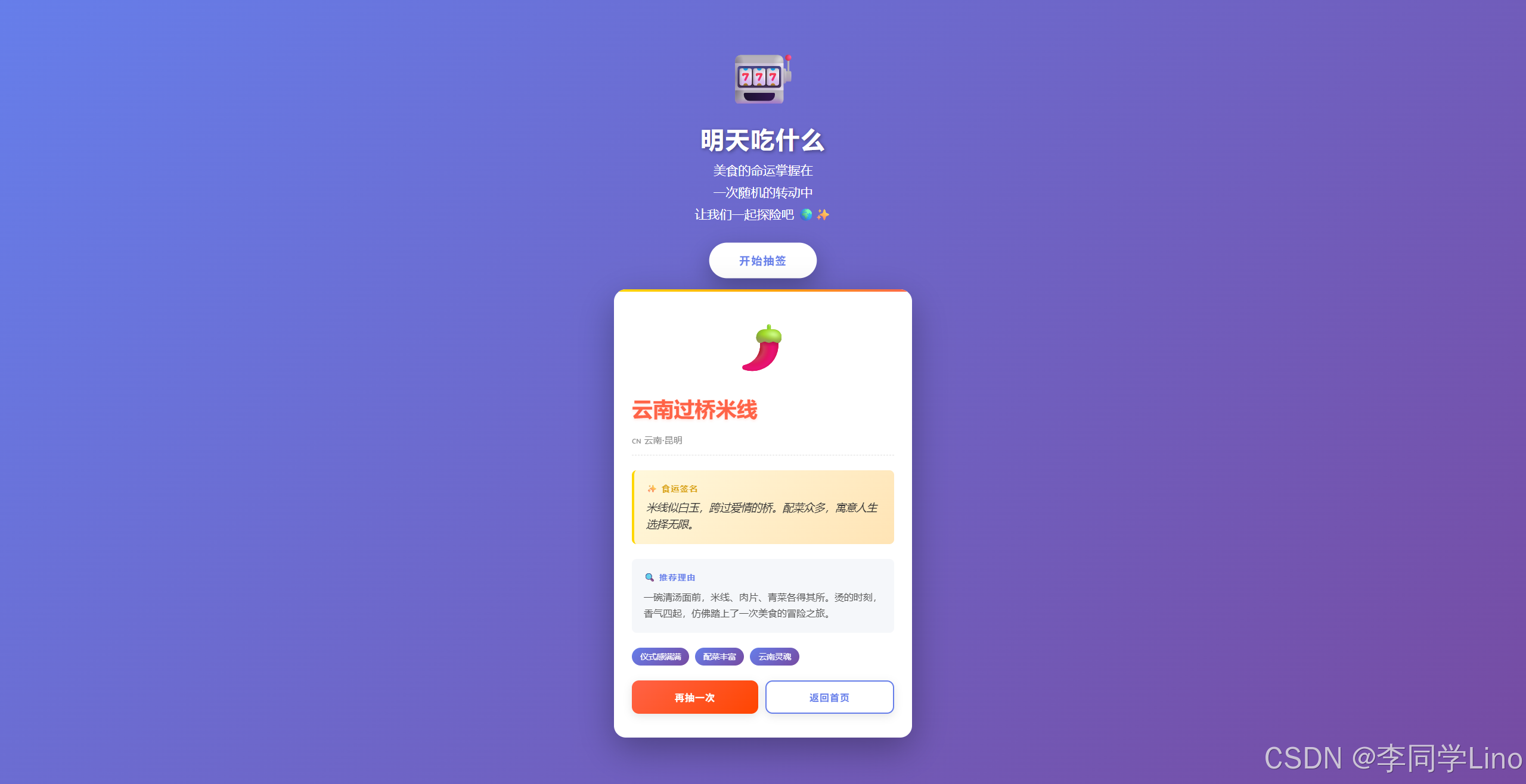 做一个“明天吃什么”应用,请以 抽签x美食探险的风格,随机生成一个“明天吃什么"应用。需包含: