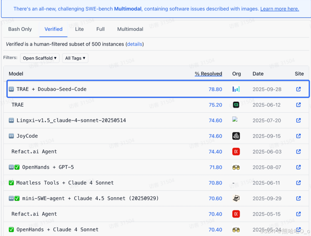 另外,Doubao-Seed-Code与字节跳动旗下IDE产品TRAE组合在一起有着更加亮眼的表现,在SWE-Bench-Verified中登顶SOTA;https://www.swebench.com/