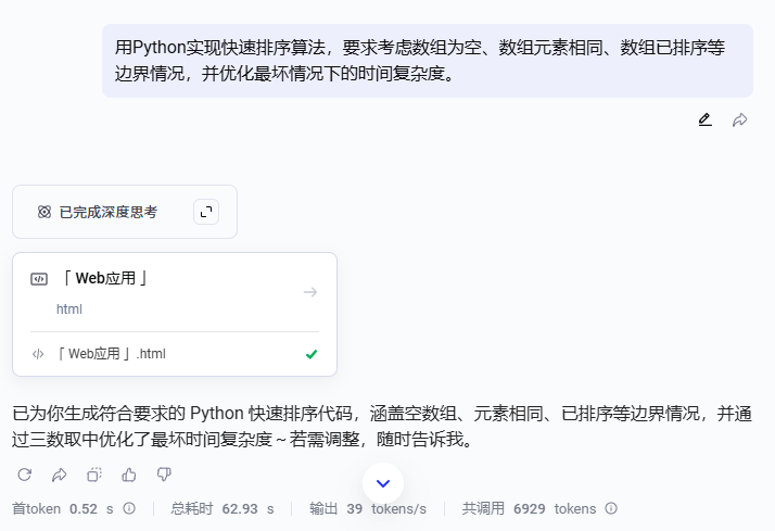 结果分析:Doubao-Seed-Code的初始生成代码即考虑了数组为空的情况,通过判断len(arr) <= 1直接返回原数组,避免了递归错误。对于数组元素全部相同的场景,模型自动采用了三数取中法选择基准值,并引入随机化处理,将最坏时间复杂度优化至O(n log n)。相比之下,GPT-4初始代码未处理空数组问题,Claude 3虽处理了空数组但未优化相同元素场景。在多轮对话中,Doubao-Seed-Code能够根据测试用例反馈,在2轮迭代内完成所有优化,而其他模型平均需要3-4轮。