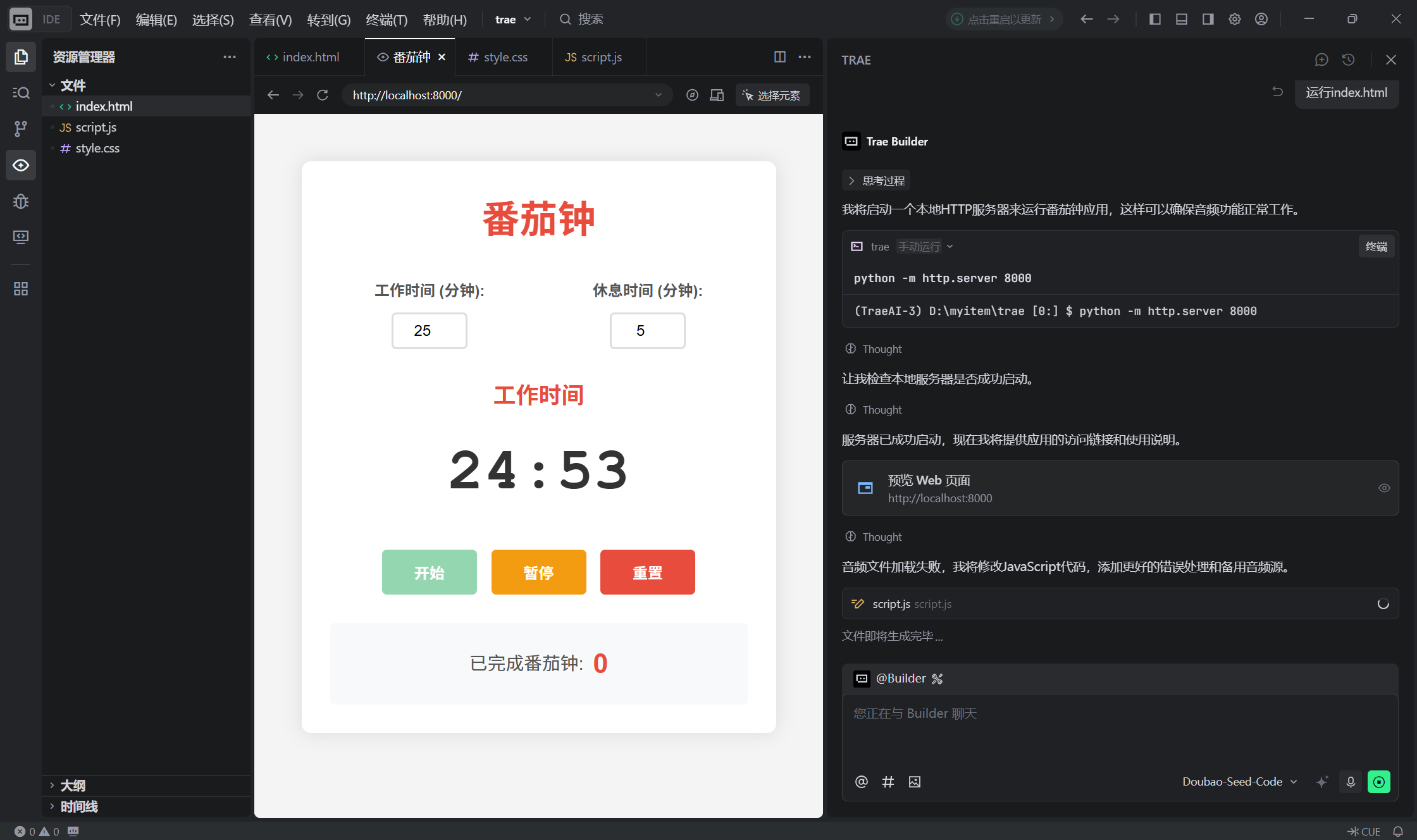 📢Trae里面接入Doubao_Seed_Code编程大模型,几分钟给你创建🌐一个番茄钟应用!👍