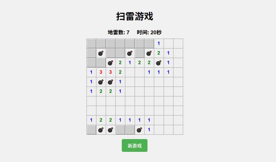 编写一个经典的扫雷游戏要求:禁止使用任何改变应用结构或组件化范式的 JavaScript 框架/库(例如:React, Vue, Angular)。可以cdn引用第三方库以满足题目要求,如Three.js,p5js。最终产物必须是纯粹的 HTML、CSS 和 JS 文件。如果需要创建多个文件(HTML/CSS/JS),请确保所有文件引用均使用相对路径。