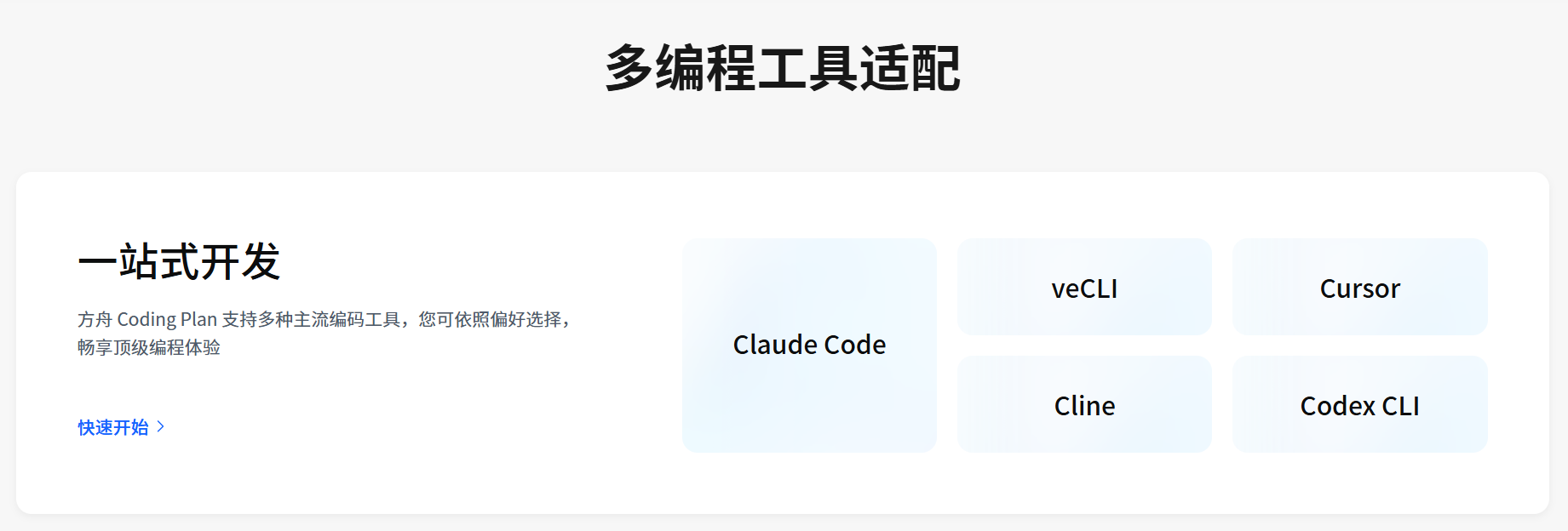 - 多生态兼容体系:为降低开发者的迁移成本,Doubao-Seed-Code深度兼容Anthropic API、TRAE开发环境等主流工具链。对于已使用Claude Code的团队,只需修改几行API调用代码即可切换到该模型,实现无缝过渡。同时,模型还支持veCLI、Cursor、Cline等开发工具,配合火山方舟平台的稳定算力,确保在高并发场景下的响应速度与可靠性。