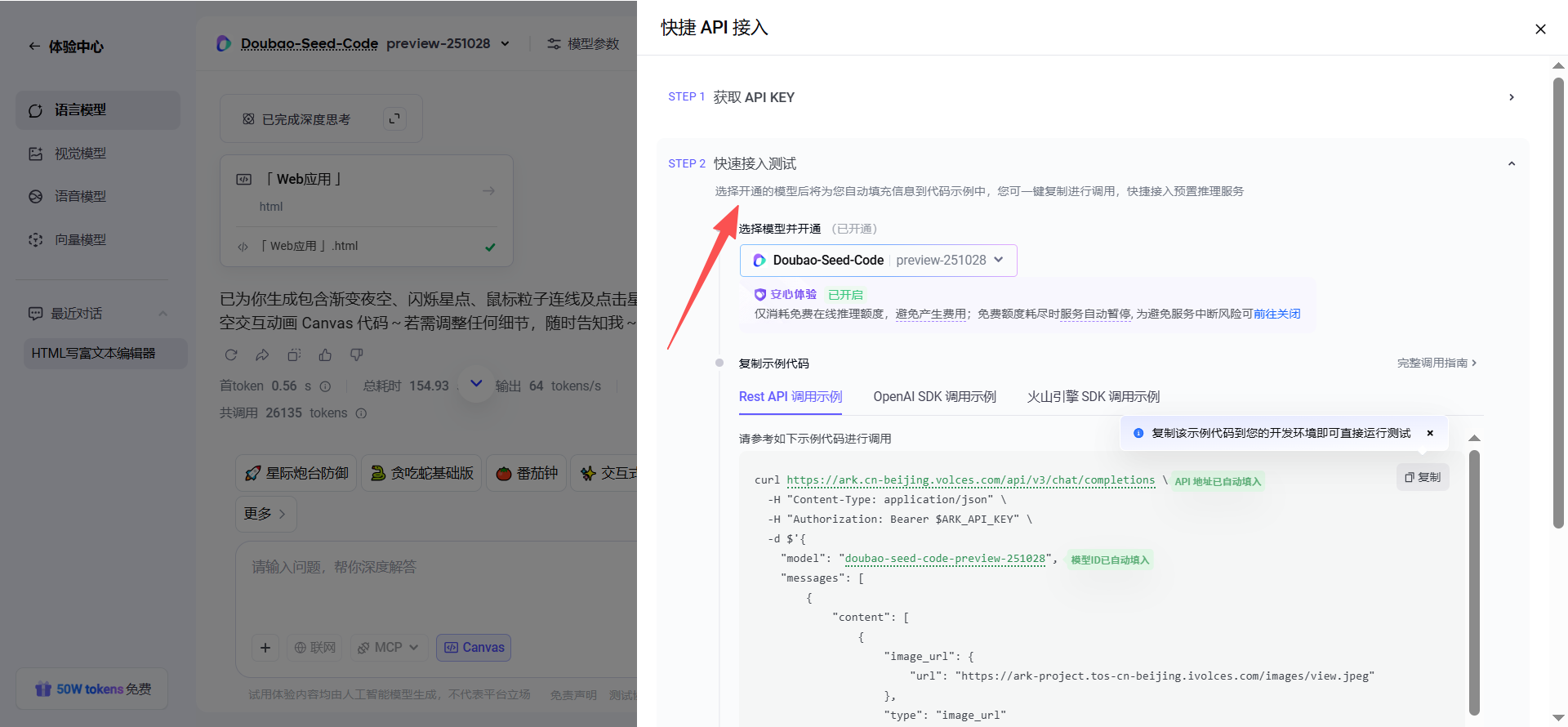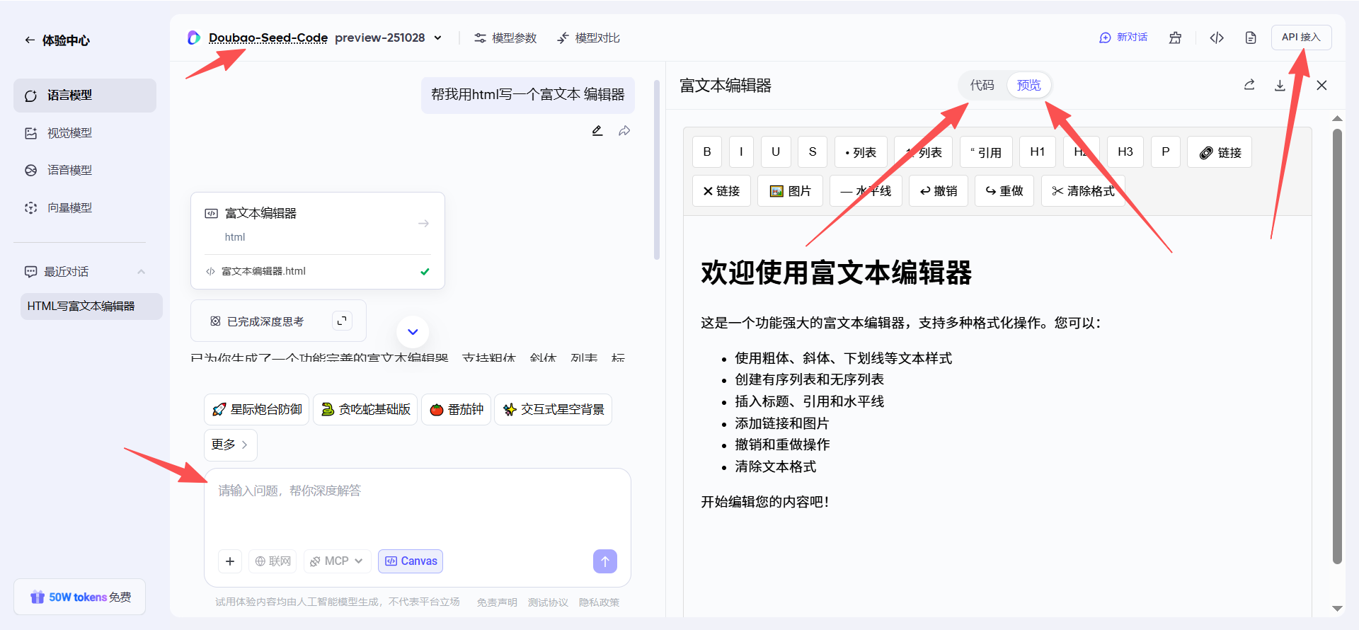 对于首次接触Doubao-Seed-Code的开发者,在线体验是最便捷的入门方式,无需配置开发环境,通过浏览器即可直接与模型交互。火山引擎为其提供了官方在线体验平台,具体操作步骤如下: