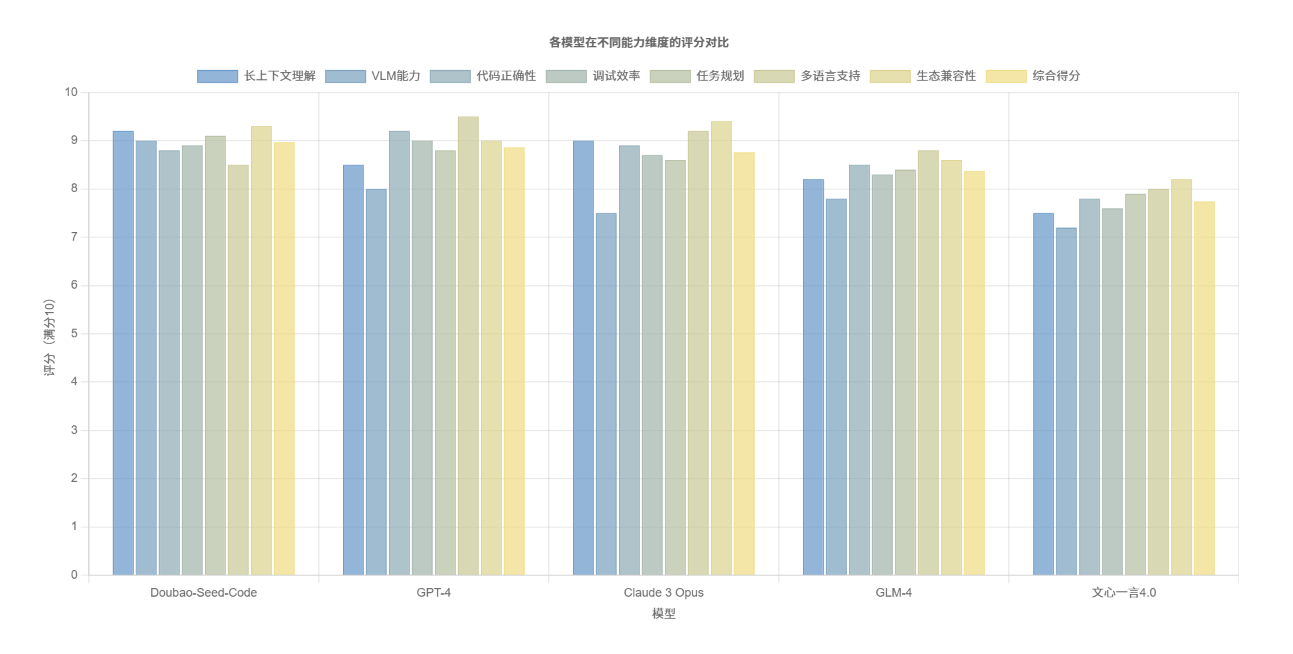 为了更客观地评估Doubao-Seed-Code的市场定位,我们选取了GPT-4、Claude 3 Opus、GLM-4、文心一言4.0四款主流代码模型,在8个核心能力维度进行量化评分(满分10分),并结合成本因素进行综合分析。