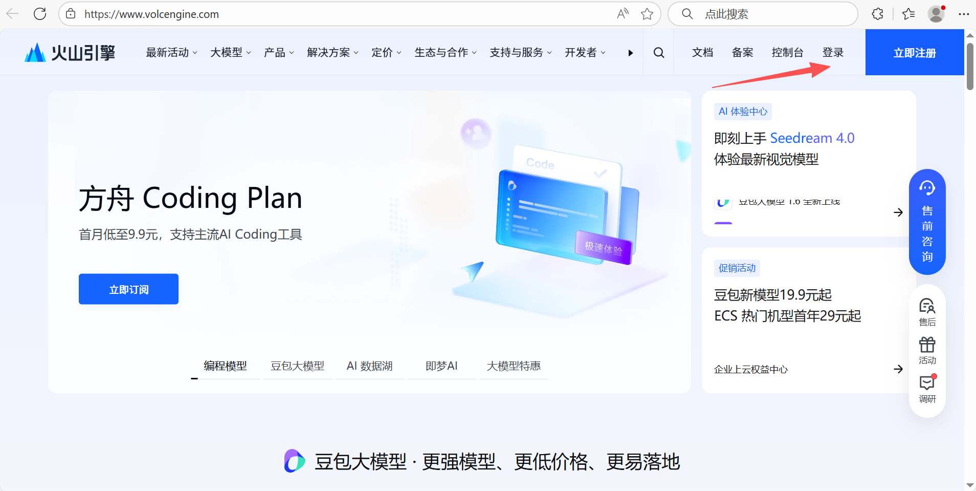 - 访问官方平台:打开浏览器输入火山引擎AI开发者平台地址(https://www.volcengine.com/),完成账号注册与登录(注册仅需手机号验证,1分钟内即可完成)。