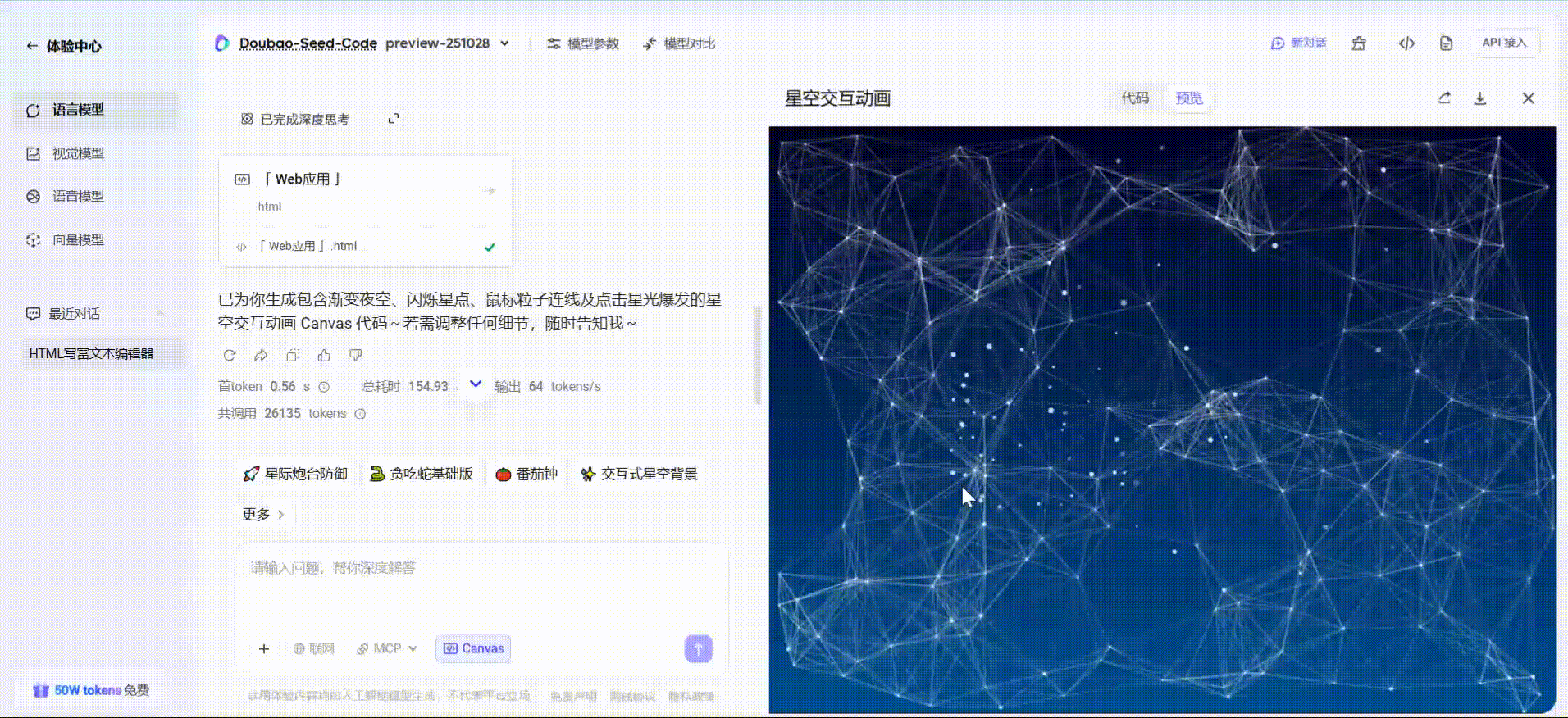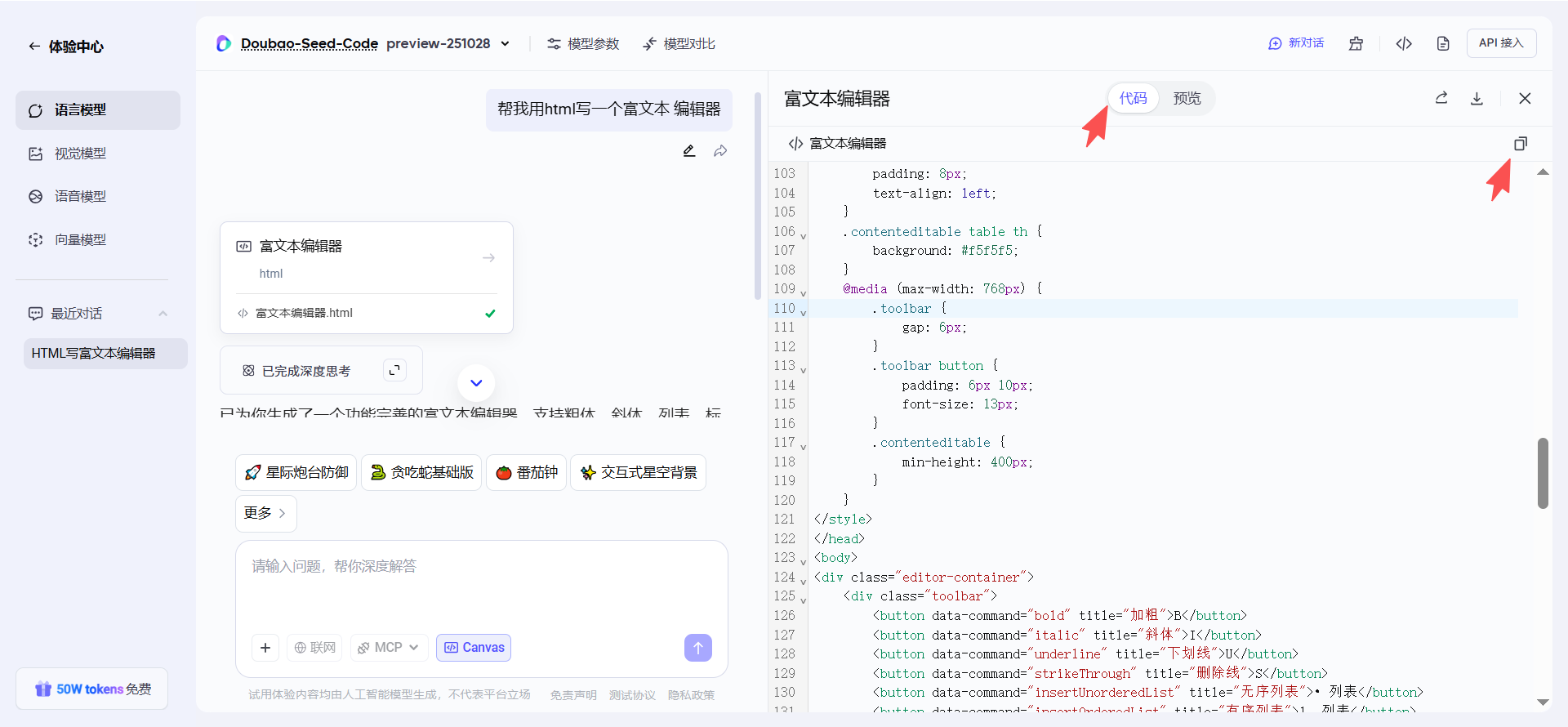 - 进入代码模型专区:在平台首页导航栏选择“模型广场”,找到“Doubao-Seed-Code”并点击“立即体验”,进入专属的在线交互界面。该界面采用左右分栏设计,左侧为对话输入区,右侧为代码展示与运行区,支持语法高亮和代码复制功能。