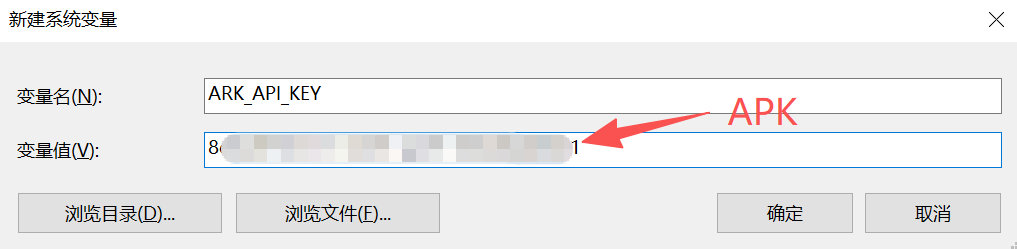 ARK_API_KEY - 变量值:您的火山引擎 API Key(从控制台获取)点击「确定」保存。