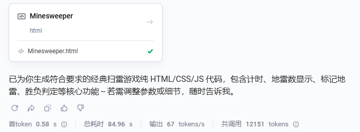 - 性能数据:首 token 生成耗时 0.58 秒,总耗时 84.96 秒,生成速度为 67 tokens / 秒,共调用了 12151 tokens。