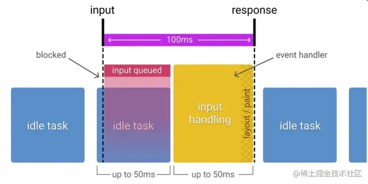 目标是在 100 毫秒内响应输入,那么,为什么我们的预算只有 50 毫秒?这是因为除输入处理外,通常还有需要执行其他工作,而且这些工作会占用可接受输入响应的部分可用时间。如果应用程序在空闲时间以推荐的 50 毫秒区块执行工作,这就意味着,如果输入在这些工作区块之一中发生,它最多可能会排队 50 毫秒。考虑到这一点,假设只有剩余的 50 毫秒可用于实际输入处理才是安全地做法。下图展示了这种影响,图中显示了在空闲任务期间收到的输入如何排队,从而减少可用的处理时间:
