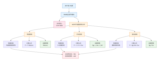 这里的核心目标不再是简单的“供电”,而是在极高的速度下,稳定、高效地管理一股巨大的“能量洪流”。50纳秒的瞬态响应 要求电源环路必须极快,这直接决定了开关频率不能低(所以选择了1MHz)。而90%以上的效率意味着,在输送近400W(0.8V * 500A)到GPU核心的过程中,整个VRM的总损耗必须被严格控制在44W以内。这个严苛的“能量预算”将像一把尺子,衡量我们后续每一个元器件的选择。