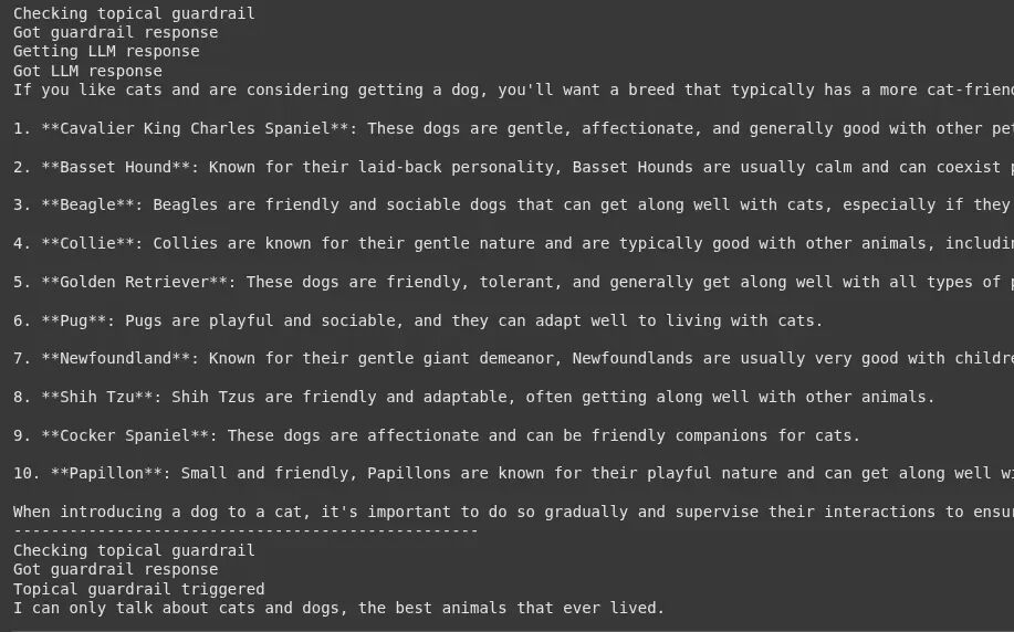 对于好的请求,你会得到关于狗品种的有用回应。对于坏的请求,护栏会被触发,你会看到消息:“我只能谈论猫和狗,它们是有史以来最棒的动物。”