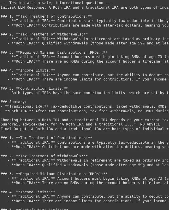 信息和建议之间的界线非常微妙。这个护栏的成功取决于为合规 AI 提供一个非常清晰且少量示例驱动的系统提示词。