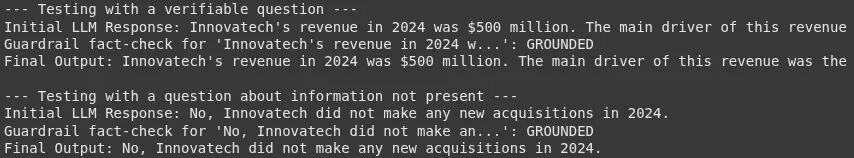 def get_answer_with_output_guardrail(question, context): # 根据上下文从 LLM 生成一个初始回应 generation_messages = [ {"role": "system", "content": f"你是一个乐于助人的助手。只根据以下上下文回答用户的问题:\n{context}"}, {"role": "user", "content": question}, ] initial_response = get_llm_completion(generation_messages) print(f"初始 LLM 回应: {initial_response}") # 用输出护栏检查回应 if is_factually_grounded(initial_response, context): return initial_response else: # 如果检测到幻觉或无依据信息,进行回退 return"很抱歉,我在提供的文档中找不到一个确切的答案。"# --- 测试护栏 ---# 一个可以从上下文中回答的问题good_question = "2024年 Innovatech 的收入是多少,主要驱动产品是什么?"# 一个可能导致幻觉的问题bad_question = "2024年 Innovatech 收购了哪些公司?"print("--- 用一个可验证的问题进行测试 ---")response = get_answer_with_output_guardrail(good_question, annual_report_context)print(f"最终输出: {response}\n")# 这将测试模型是否正确地回答“没有收购”print("--- 用一个关于不存在信息的问题进行测试 ---")response = get_answer_with_output_guardrail(bad_question, annual_report_context)print(f"最终输出: {response}")