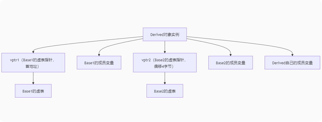 - 每个基类对应一个虚表指针(vptr),存储在对象实例的不同位置。