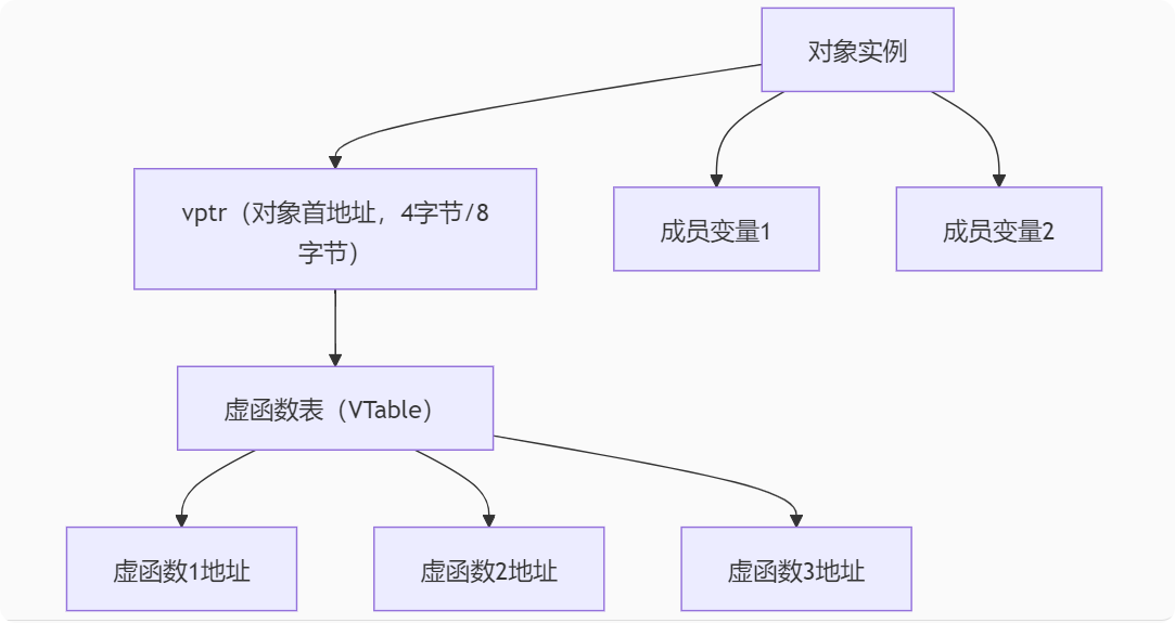 - 当调用虚函数时,程序通过vptr找到VTable,再通过偏移找到对应的函数地址,实现动态绑定。