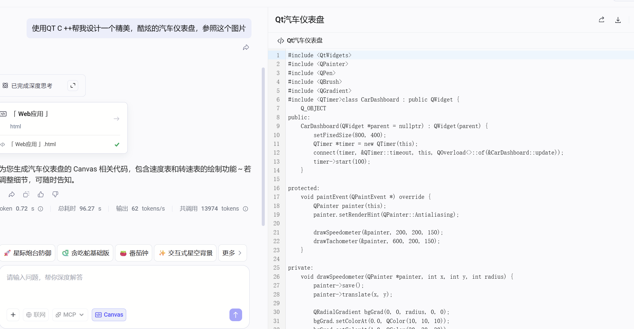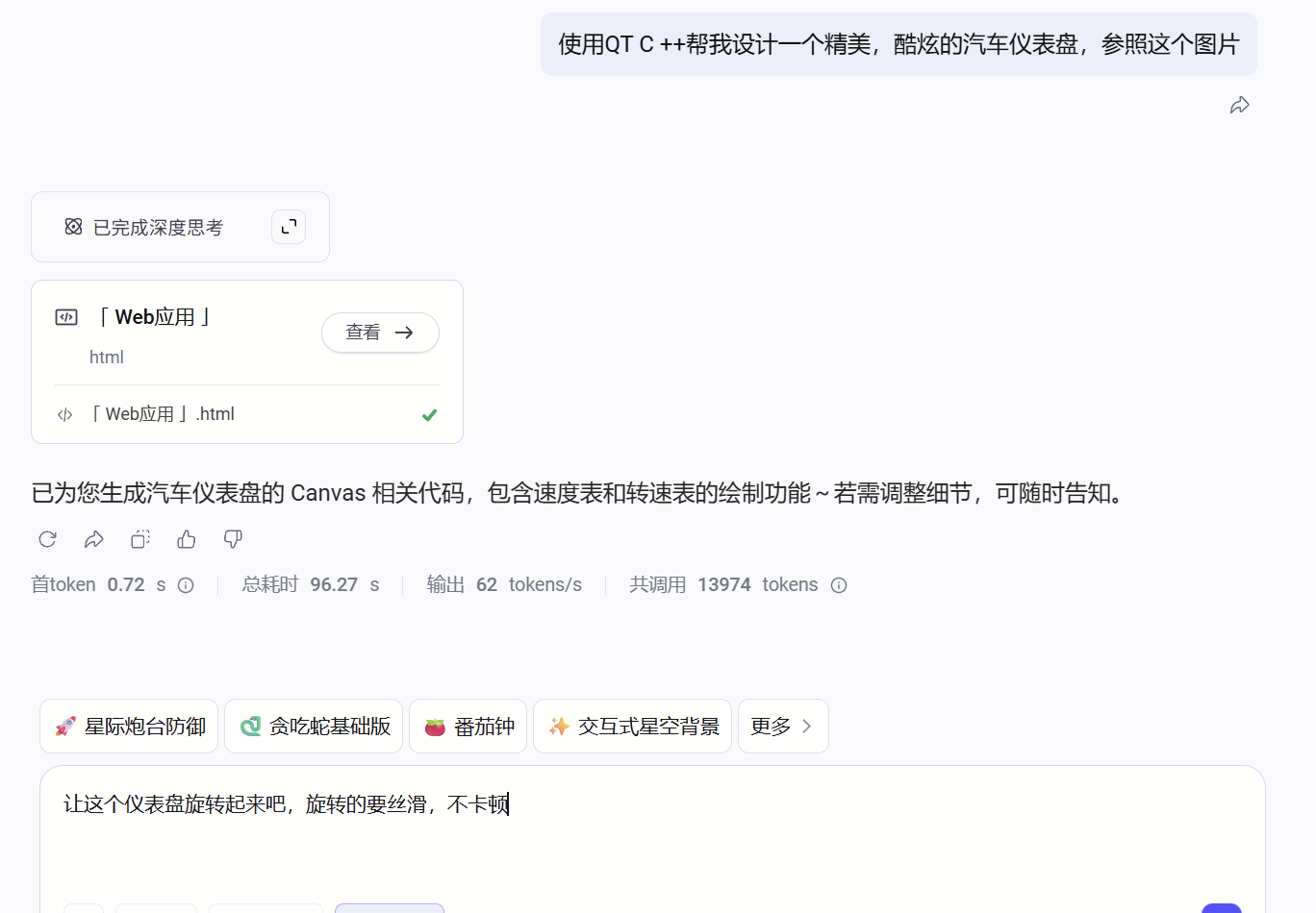 最近我一直在做QT仪表盘的项目,这个大家都比较熟悉,就是汽车仪表盘,但是这个东西看起来就是很容易,其实你要设计一个精美的仪表盘还真的有难度,那接下来我们用Doubao-Seed-Code来进行尝试: