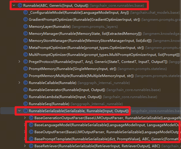 而 RunnableSerializable 在 Runnable 基础上增加 序列化/反序列化 能力,作为 LangChain 内部链路的父类基类。