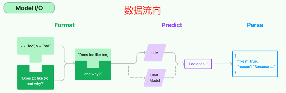 表示数据将依次传入提示模板、模型和输出解析器,最终输出结构化结果。