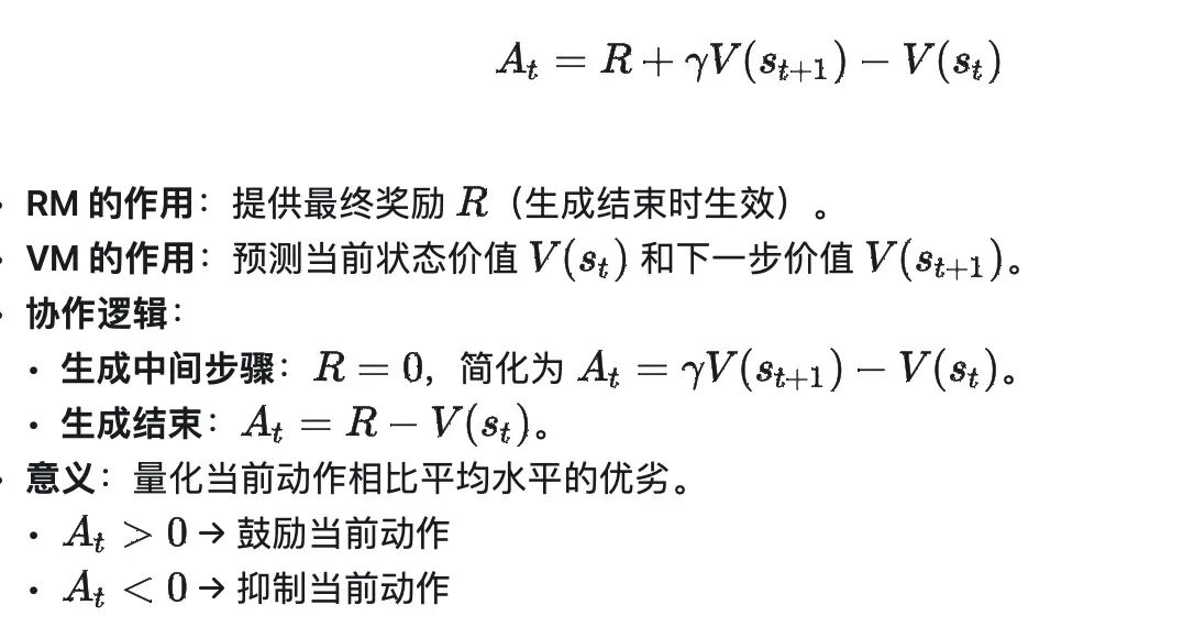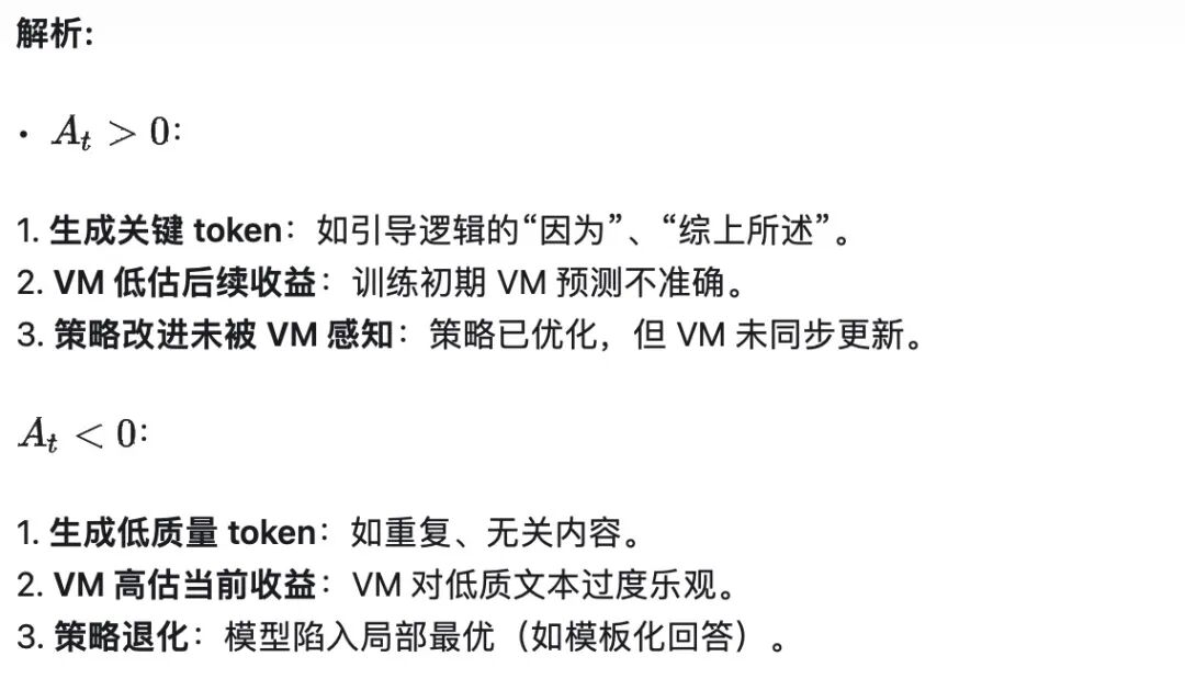 - 序列决策支持:生成文本是逐步进行的,VM 帮助模型权衡当前动作对未来的影响。通过优势函数指导模型优化