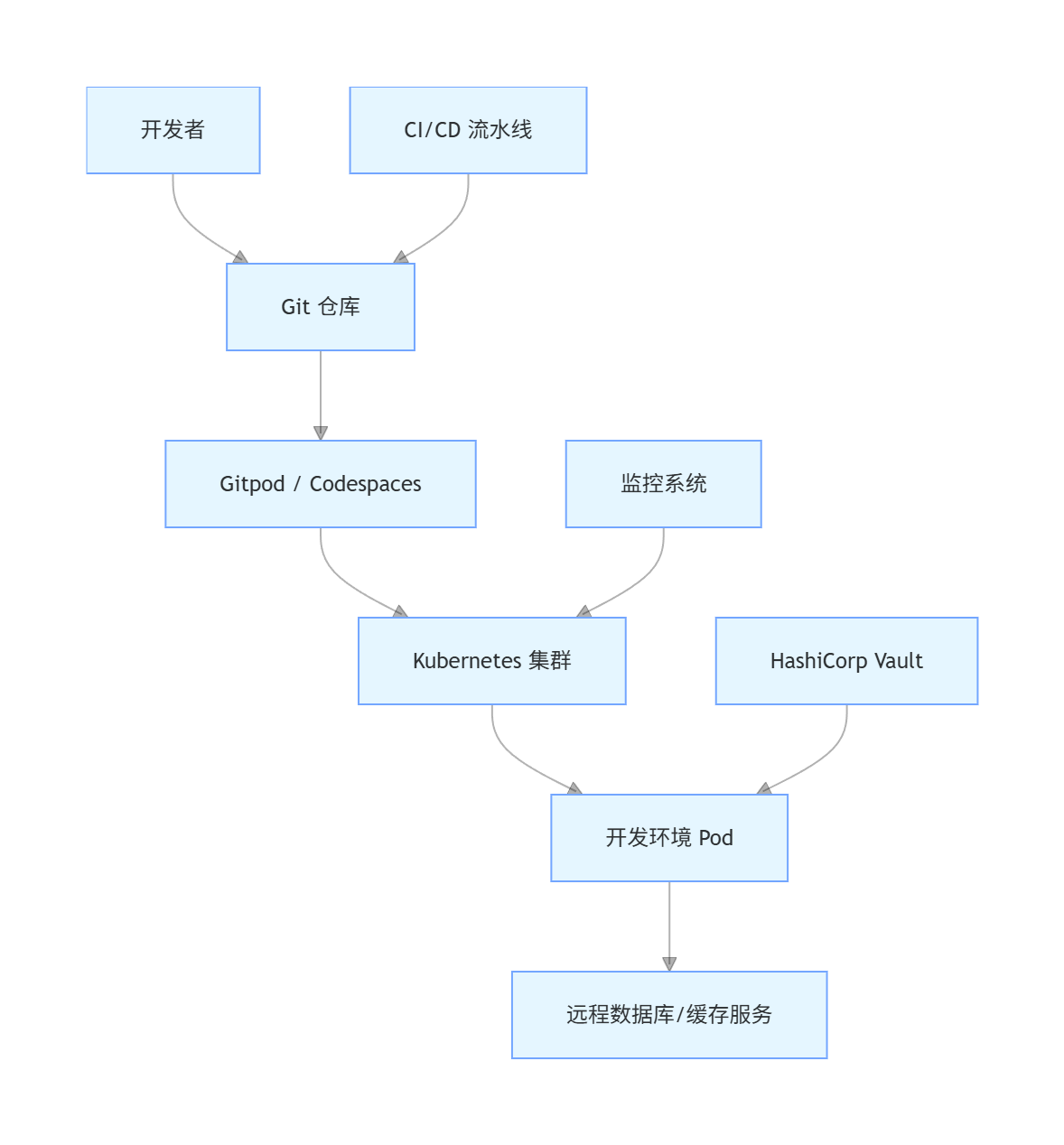 对于中大型团队,一个更规模化的方案是使用 Gitpod 或 GitHub Codespaces,结合 Kubernetes 和 HashiCorp Vault 等工具。