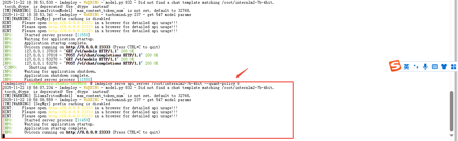 lmdeploy serve api_server /root/internlm2-7b-4bit --quant-policy 8