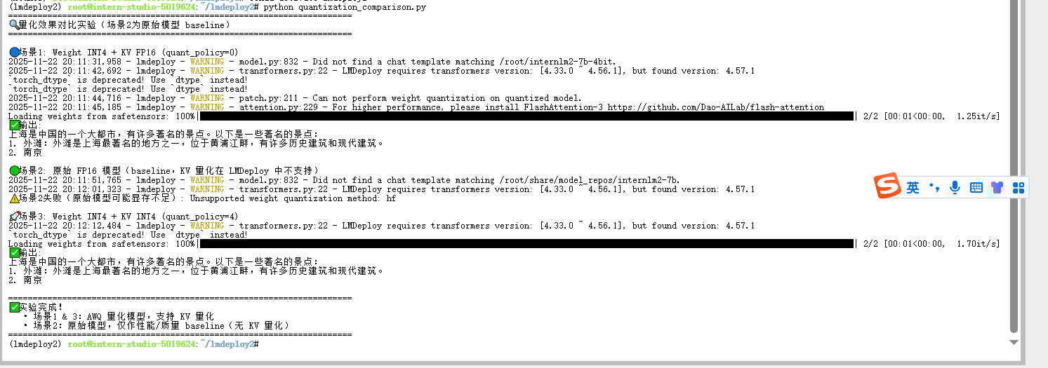 由于 LMDeploy 的两个推理后端在量化支持上存在结构性差异,三种量化场景无法在同一后端下进行真实横向对比:PyTorchEngine 只支持 AWQ 权重量化,不支持 KV Cache 量化;导致场景 1/3(使用 AWQ)只能在 PyTorchEngine 运行,而场景 2(使用 KV 量化)只能在 TurboMind 运行。因此,理论上描述的三种量化策略无法在统一条件下获得可比的实测结果