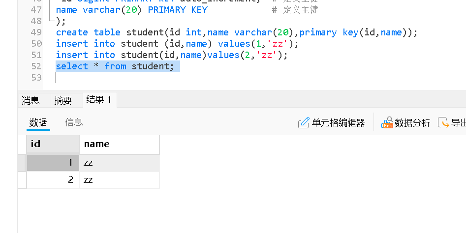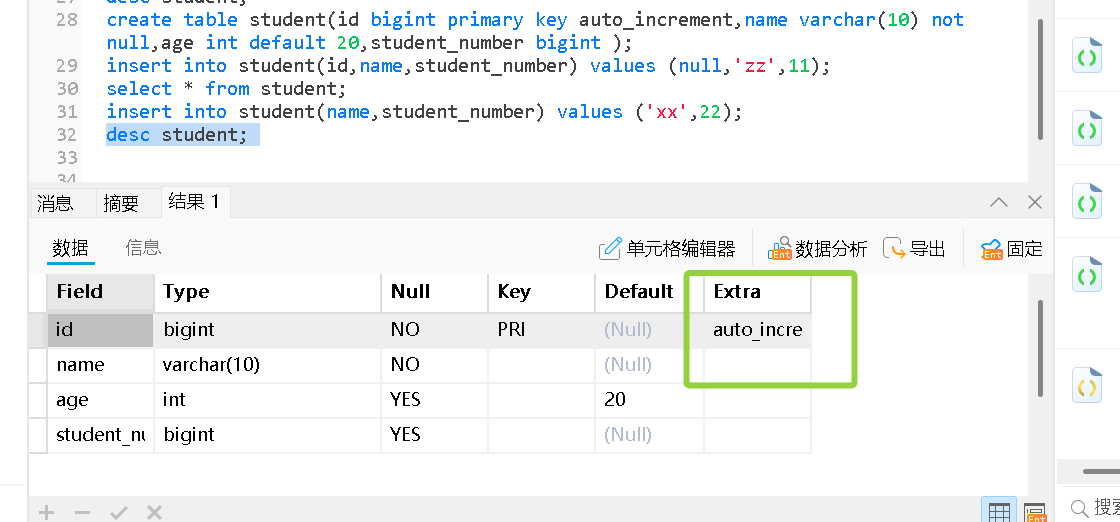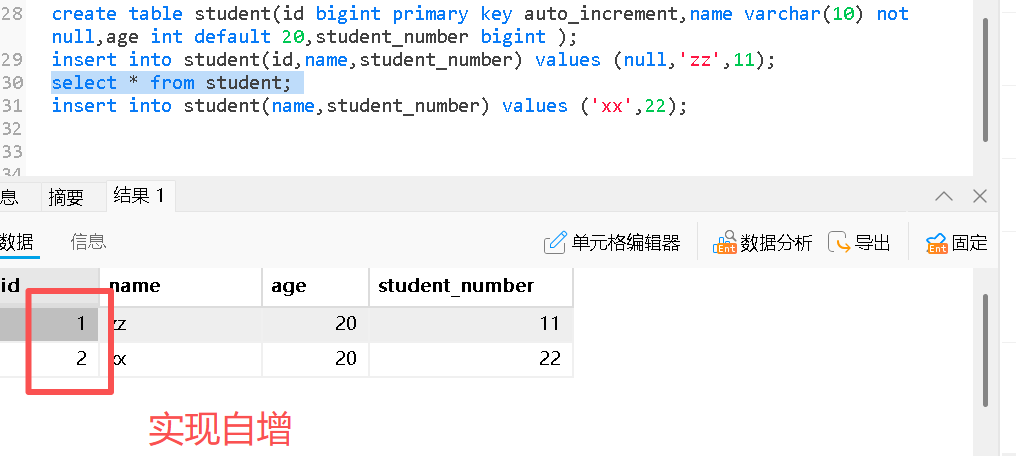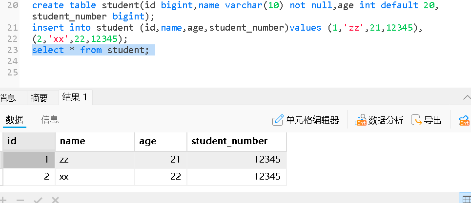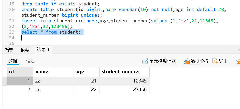 create table student(id bigint primary key auto_increment,name varchar(10) not null,age int default 20,student_number bigint unique );