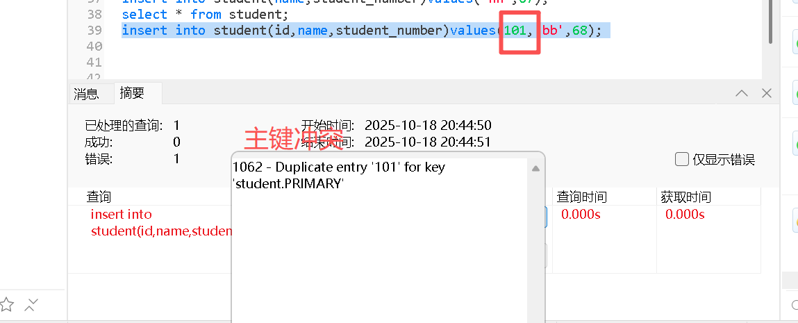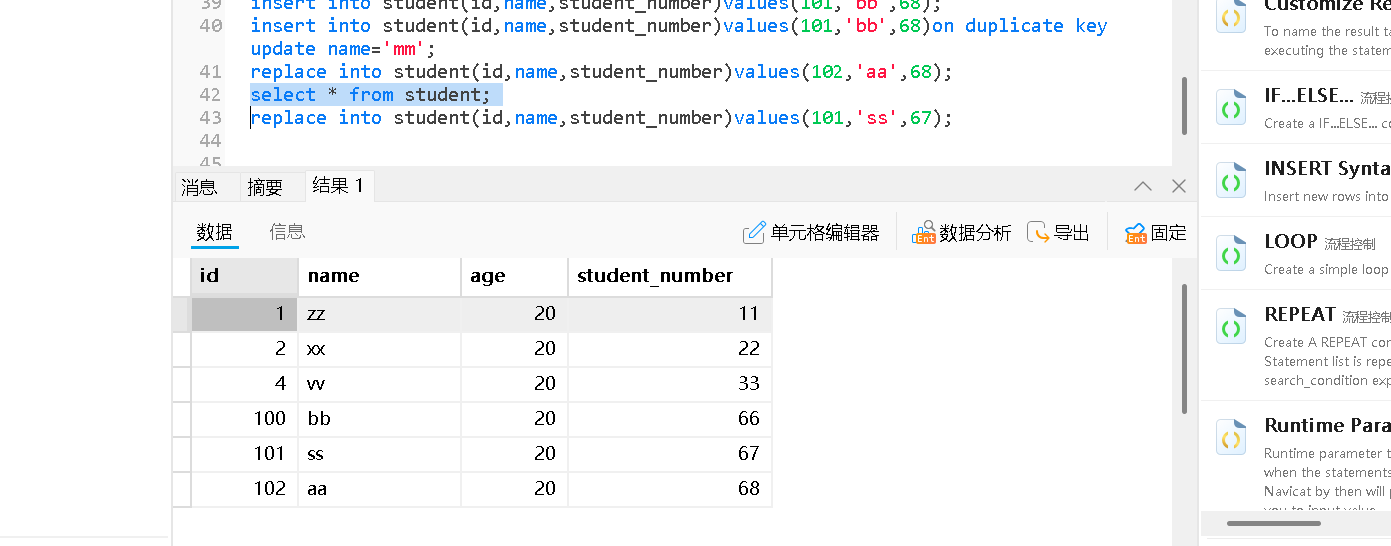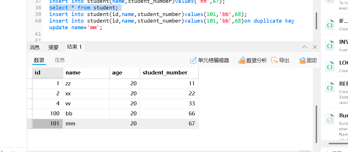 insert into student(id,name,student_number)values(101,'bb',68)on duplicate key update name='mm';