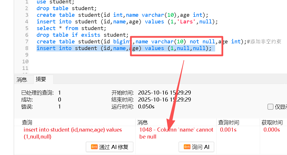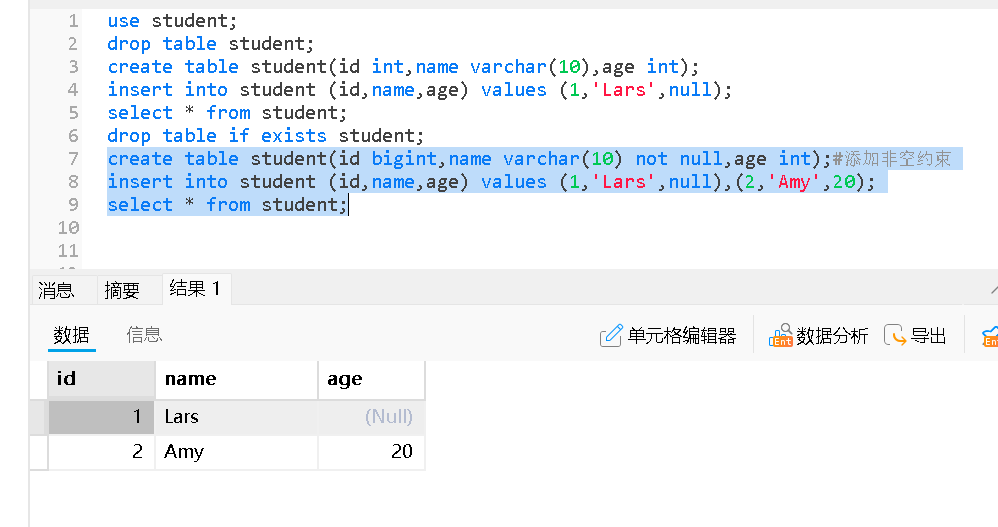 create table student(id bigint,name varchar(10) not null,age int);#添加非空约束