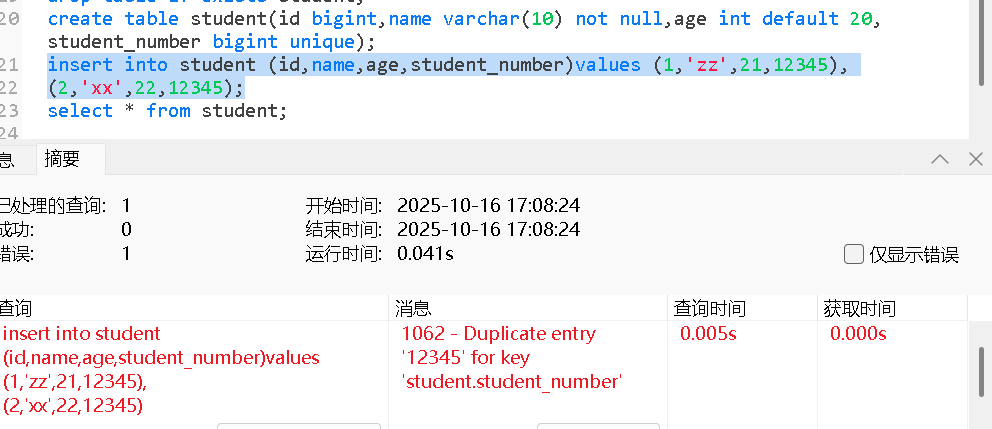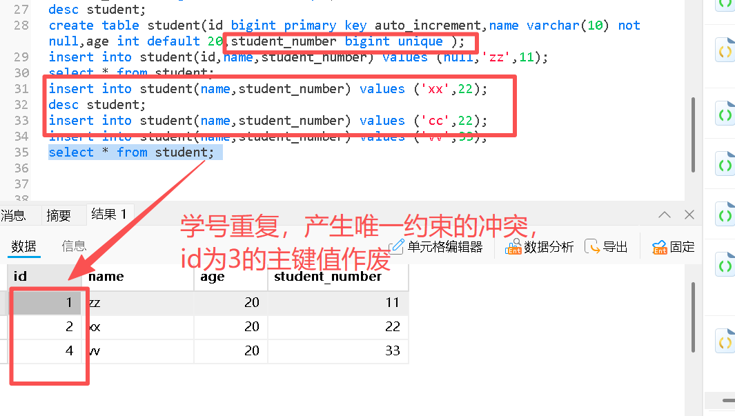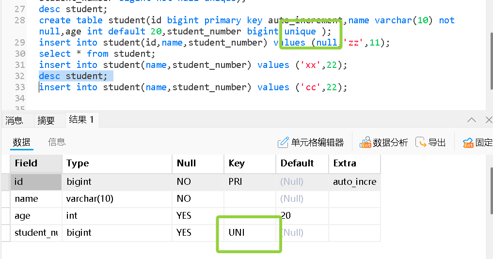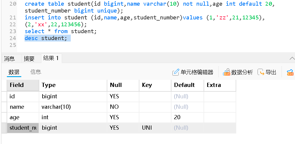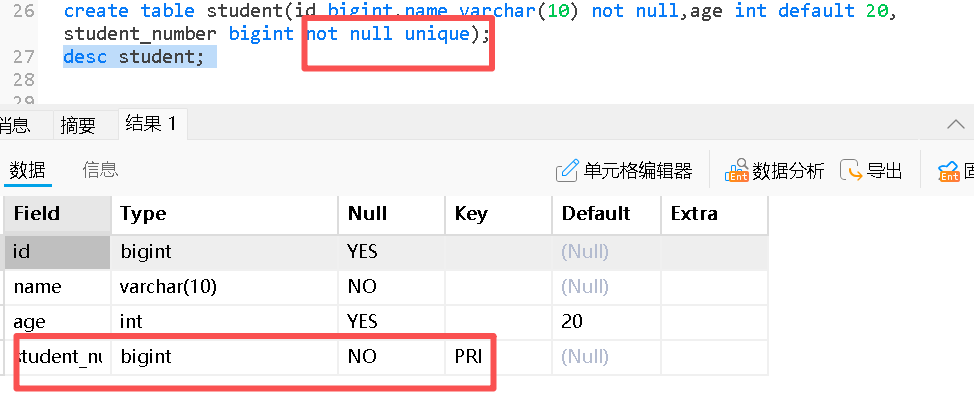 create table student(id bigint,name varchar(10) not null,age int default 20,student_number bigint unique);
