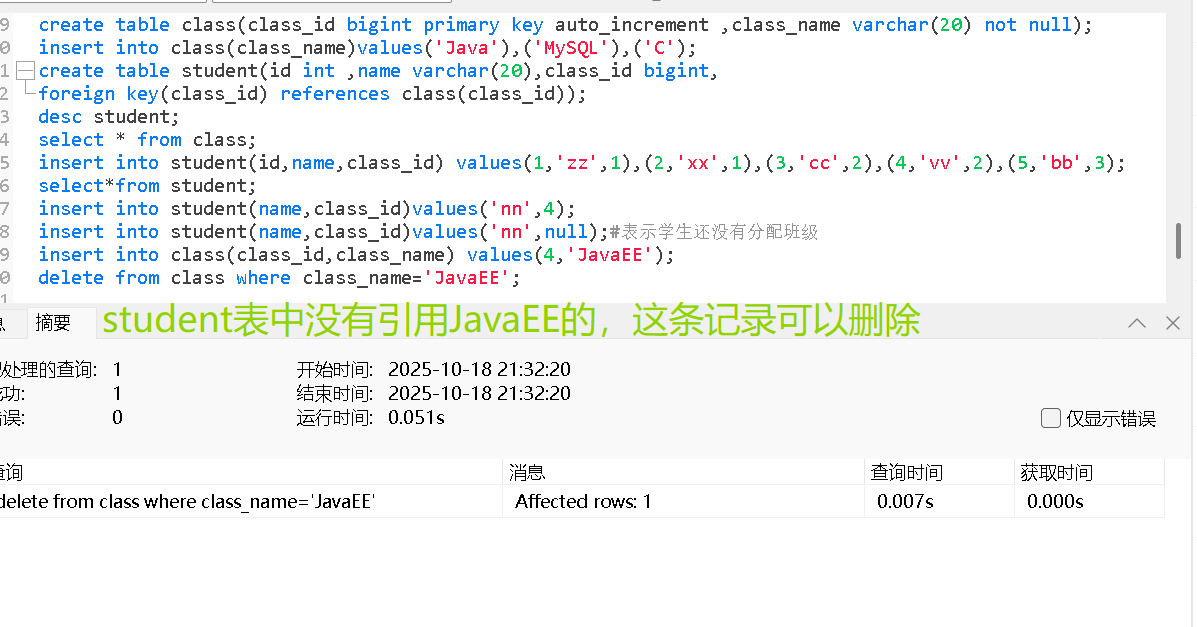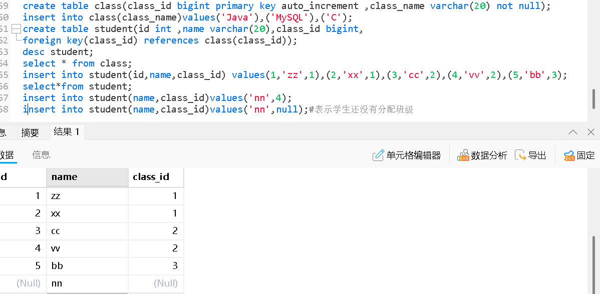 insert into student(name,class_id)values('nn',null);#表示学生还没有分配班级