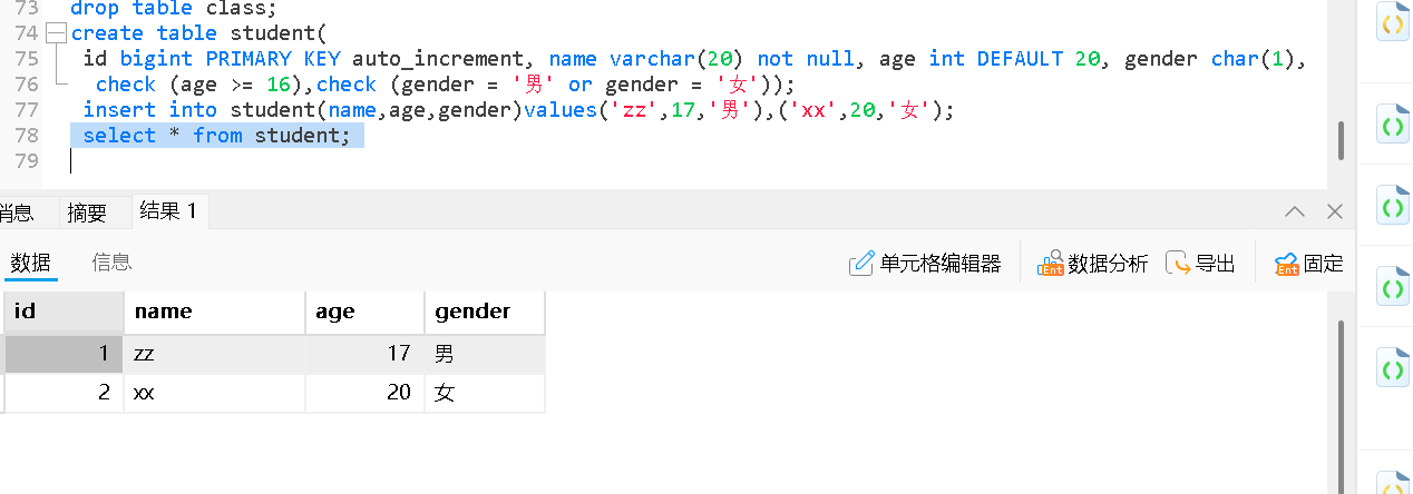 insert into student(name,age,gender)values('zz',17,'男'),('xx',20,'女');