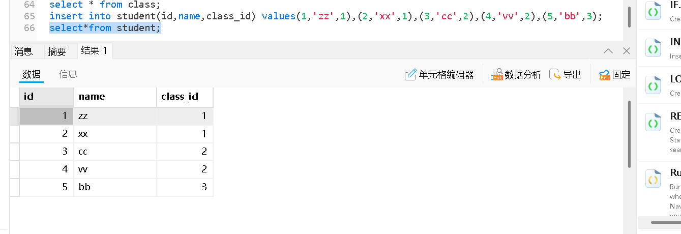 insert into student(id,name,class_id) values(1,'zz',1),(2,'xx',1),(3,'cc',2),(4,'vv',2),(5,'bb',3);