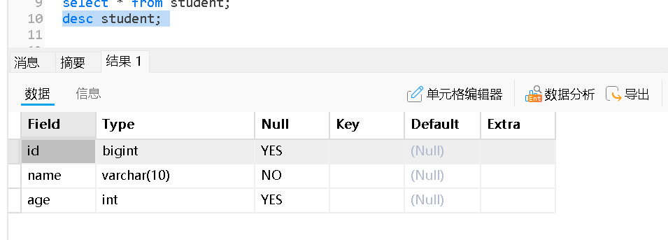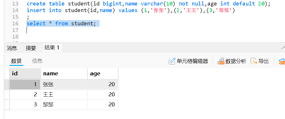 create table student(id bigint,name varchar(10) not null,age int default 20);