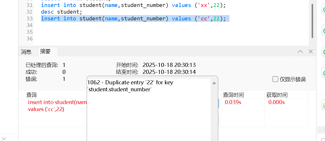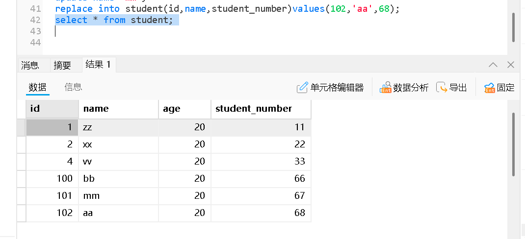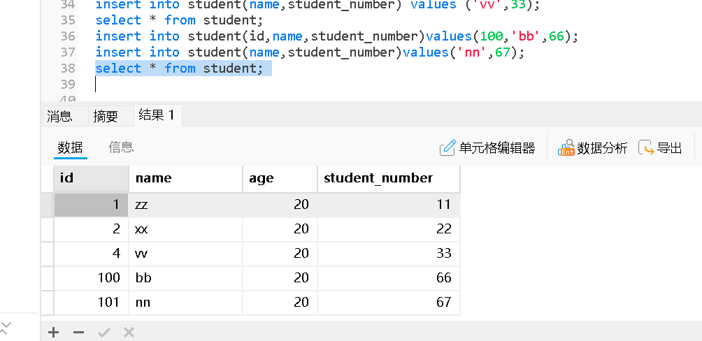 insert into student (id,name,age,student_number)values (1,'zz',21,12345),