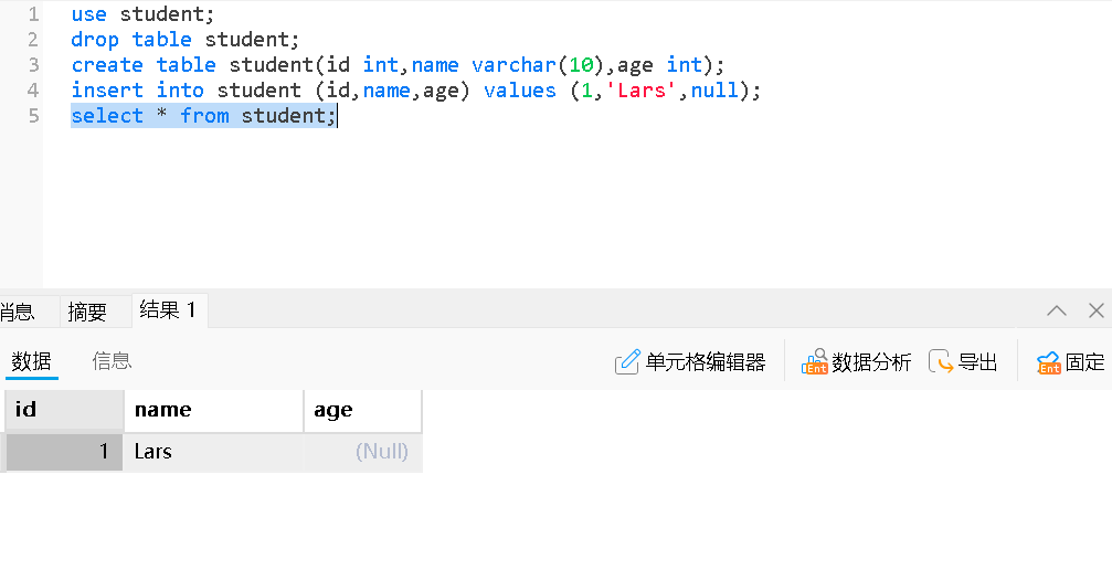 insert into student (id,name,age) values (1,'Lars',null),(2,'Amy',20);