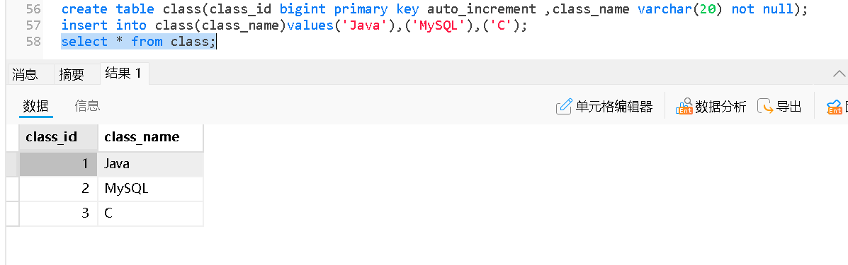 create table class(class_id bigint primary key auto_increment ,class_name varchar(20) not null);