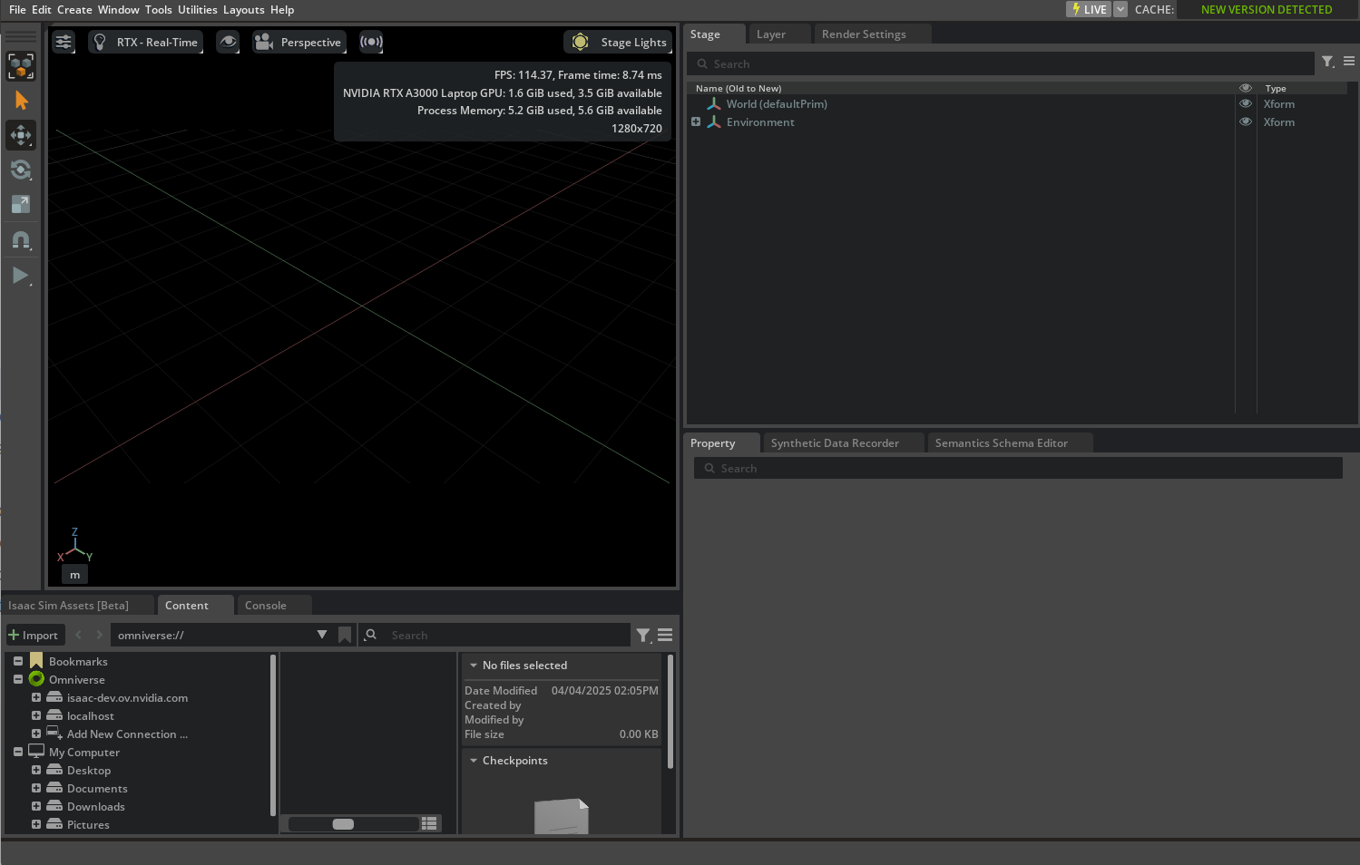 有关应用程序选择器的详细信息,请参阅 Isaac Sim 应用程序选择器。此时将打开另一个命令窗口并运行脚本。此过程可能需要比预期更长时间。过程中可能会出现空白窗口,看起来像是安装失败,请继续等待。 - 待 Isaac Sim 开发环境完全启动后,请确认您能看到: