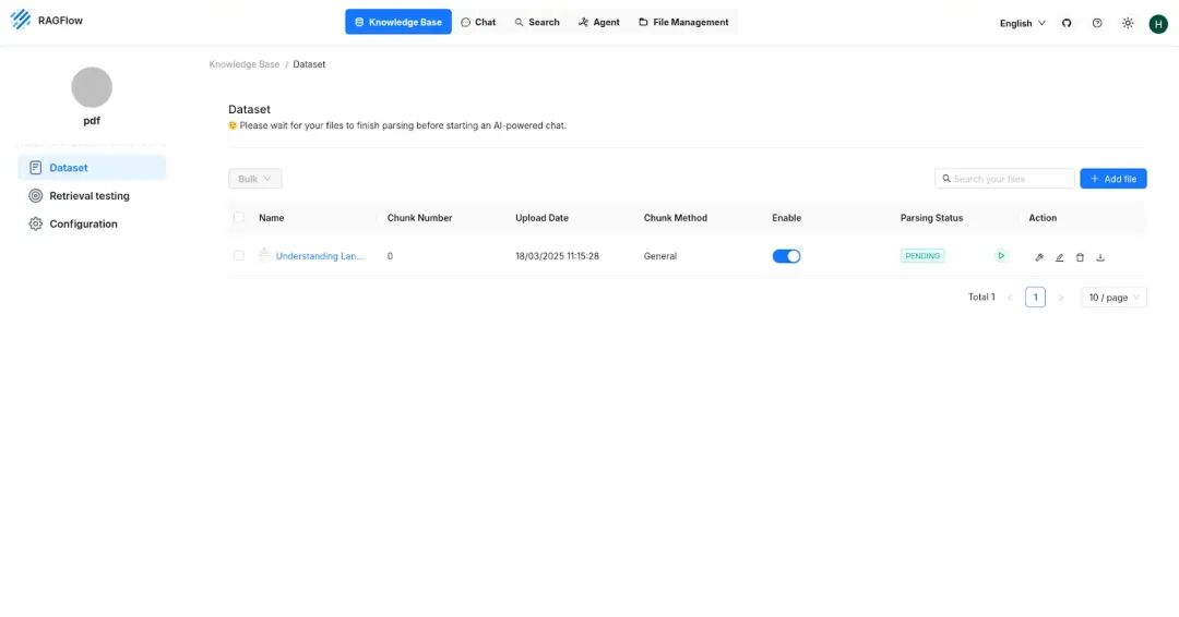 - 现在进入“datasets”(数据集),上传你想要的PDF,然后点击“Parsing status”(解析状态)列旁边的“Play”按钮,等待PDF解析完成。