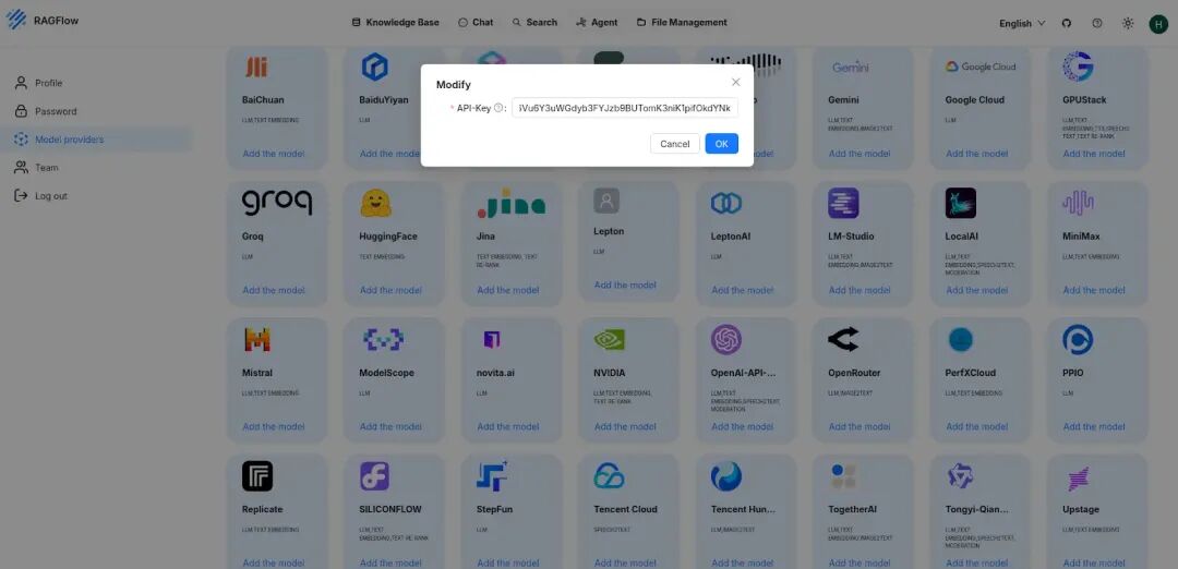 - 进入“Model Providers”(模型提供商),选择你要使用的LLM模型(这里我们使用Groq),并粘贴其API密钥。